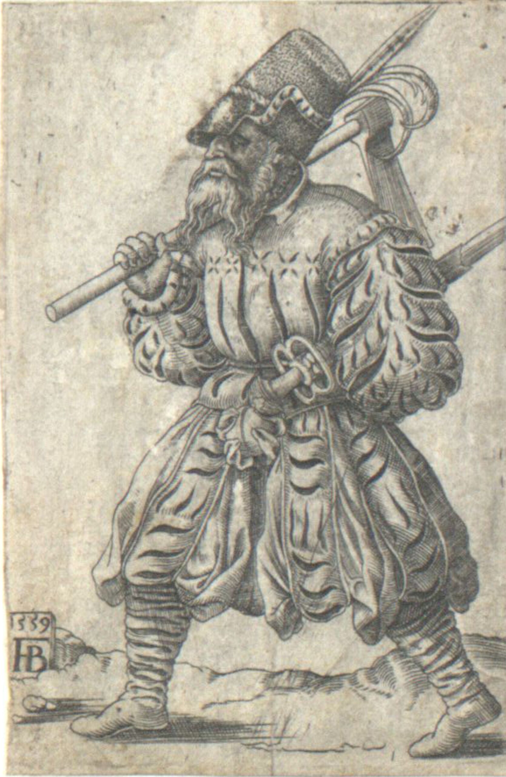 - Fußsoldat mit einer Axt, Blatt aus einer Folge von seitenverkehrten Kopien nach Bincks Folge der Offiziere und Soldaten (H. 171 - 186) (vom Bearbeiter vergebener Titel)