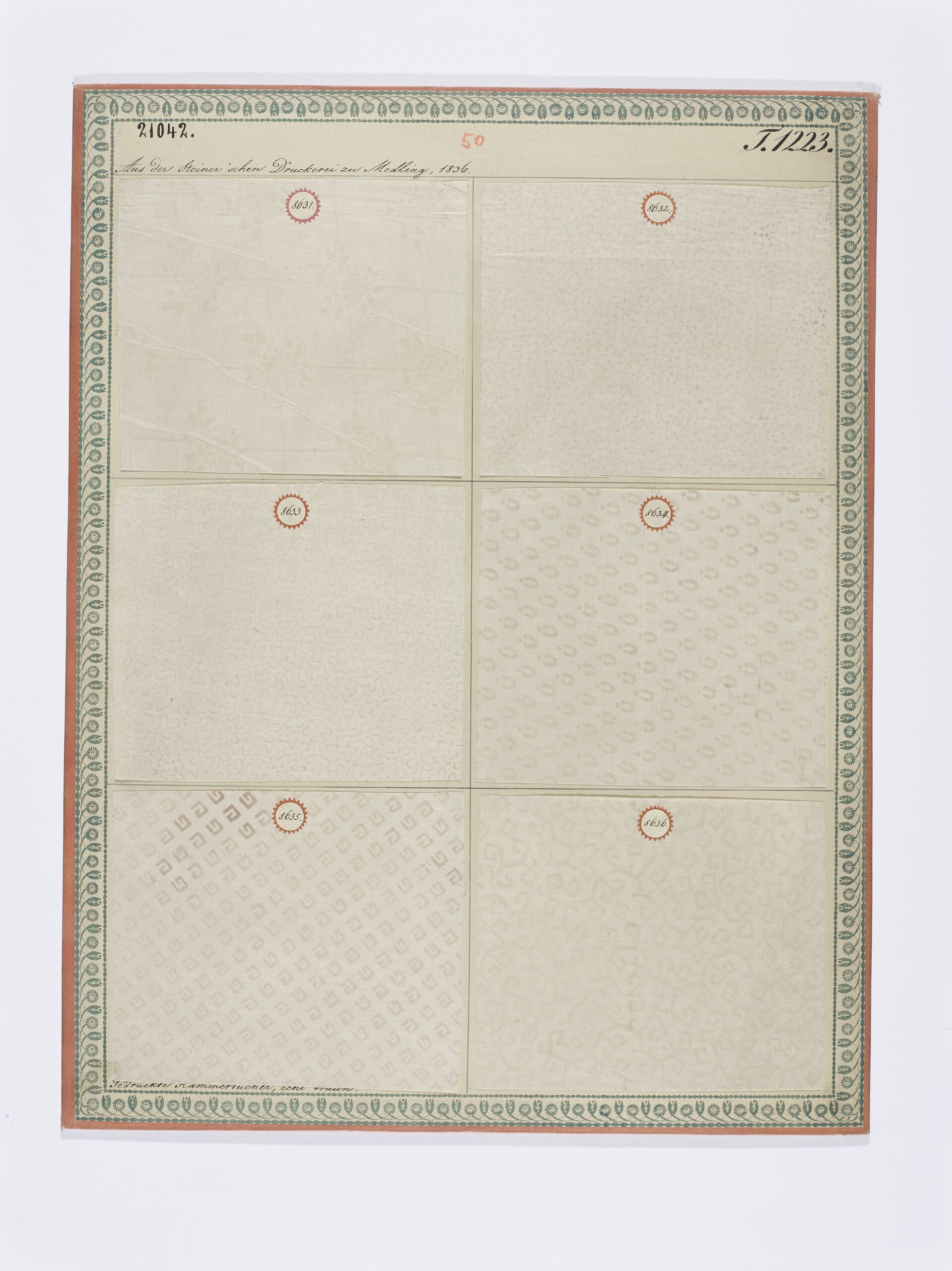 - Beschriftung (Vorderseite) : Aus der Steiner'schen Druckerei zu Mödling, 1836. / Gedruckte Kammertücher, echt braun.