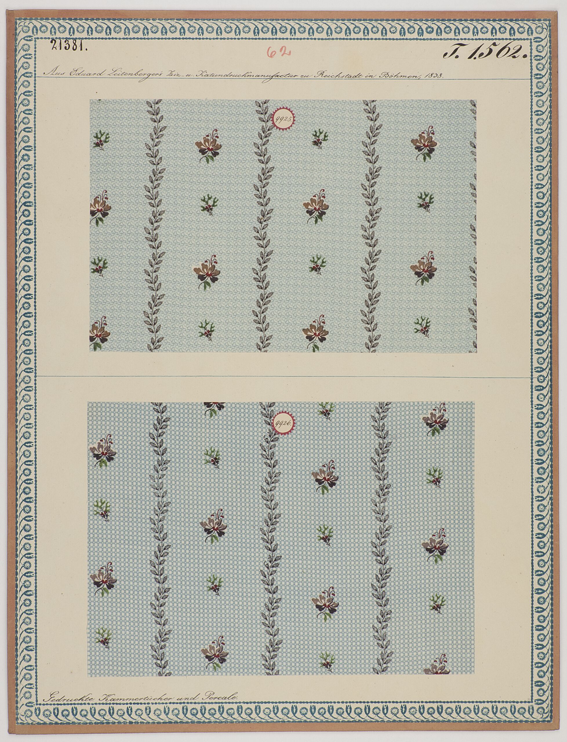 - Beschriftung (Vorderseite) : Aus Eduard Leitenberger's Ziz- u. Kattundruckmanufactur zu Reichstadt in Böhmen 1838. / Gedruckte Kammertücher und Percale.