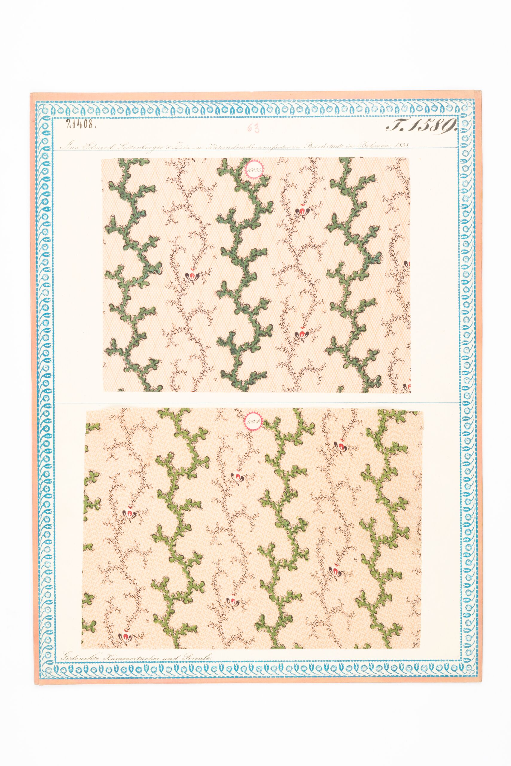 - Beschriftung (Vorderseite) : Aus Eduard Leitenberger's Ziz- u. Kattundruckmanufactur zu Reichstadt in Böhmen 1838. / Gedruckte Kammertücher und Percale.