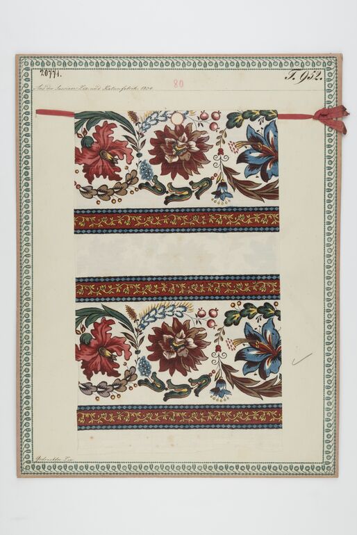 - Beschriftung (Vorderseite) : Aus der Ziz- und Kattunfabrik zu Sassin in Ungarn, 1829. / Gedruckte Kammertücher.