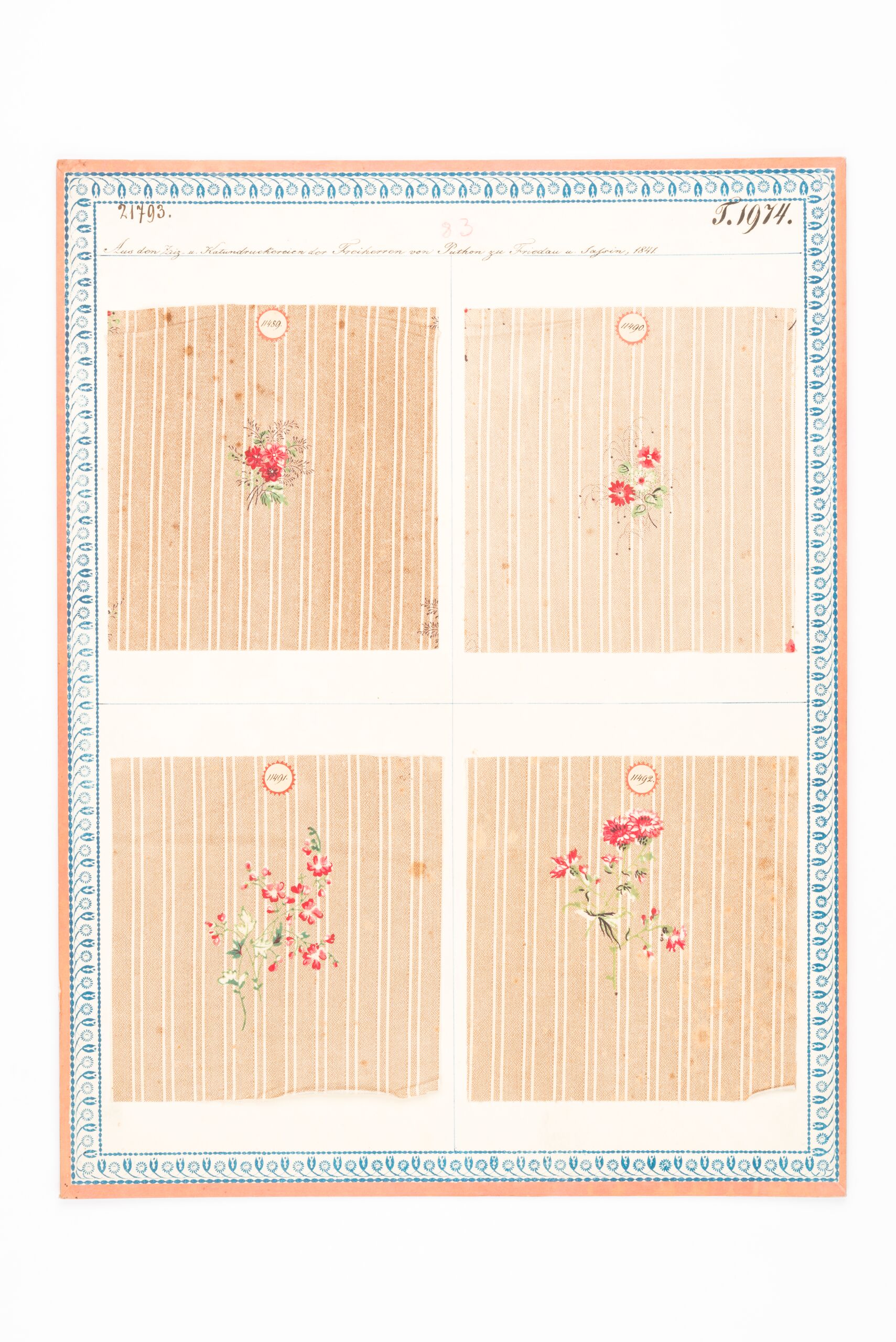 - Beschriftung (Vorderseite) : Aus den Ziz- u. Kattundruckereien des Freiherren v. Puthon zu Fridau u. Sassin, 1841. / Gedruckte Kammertücher.