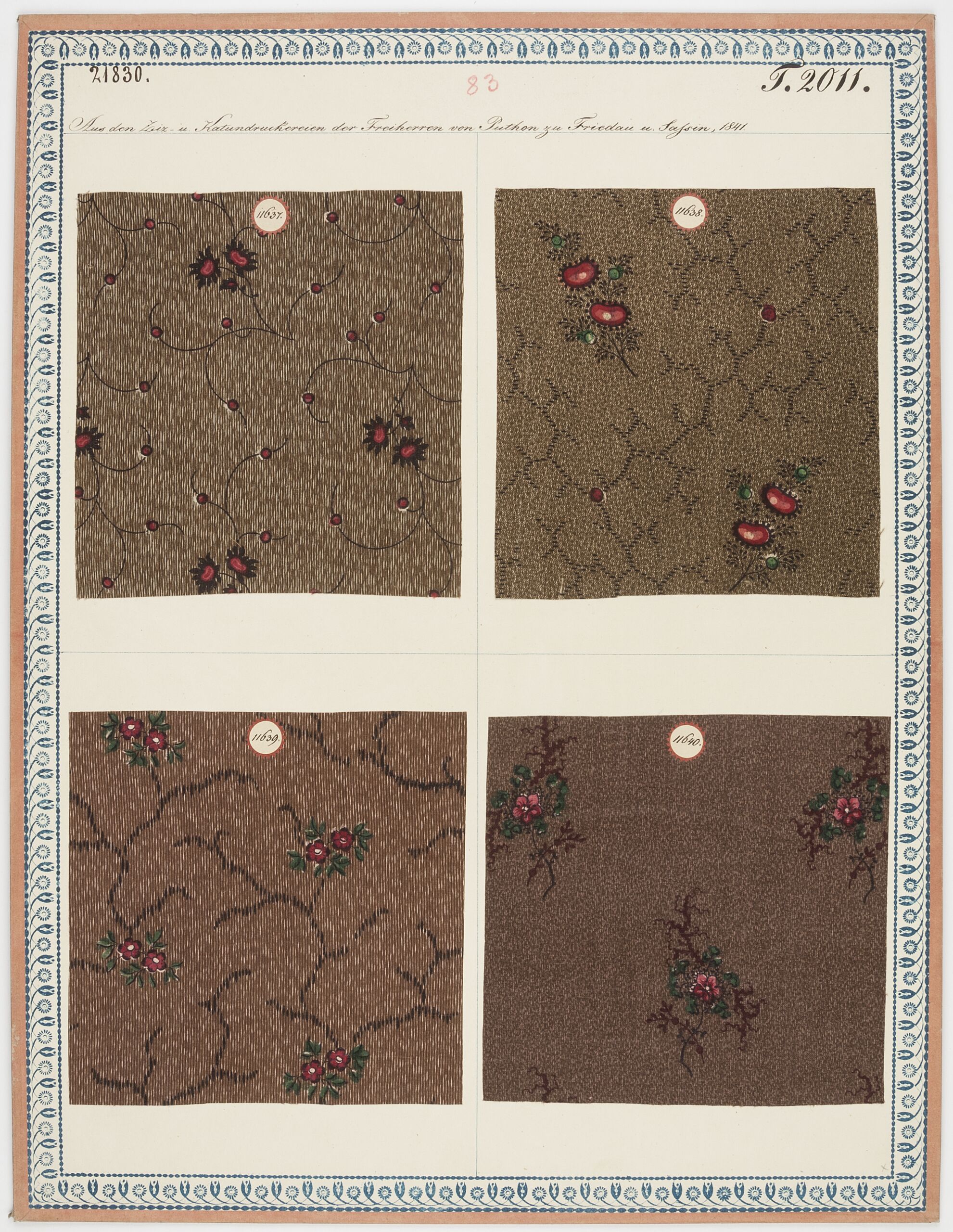 - Beschriftung (Vorderseite) : Aus den Ziz- u. Kattundruckereien des Freiherren v. Puthon zu Friedau u. Sassin, 1841. / Gedruckte Kammertücher.