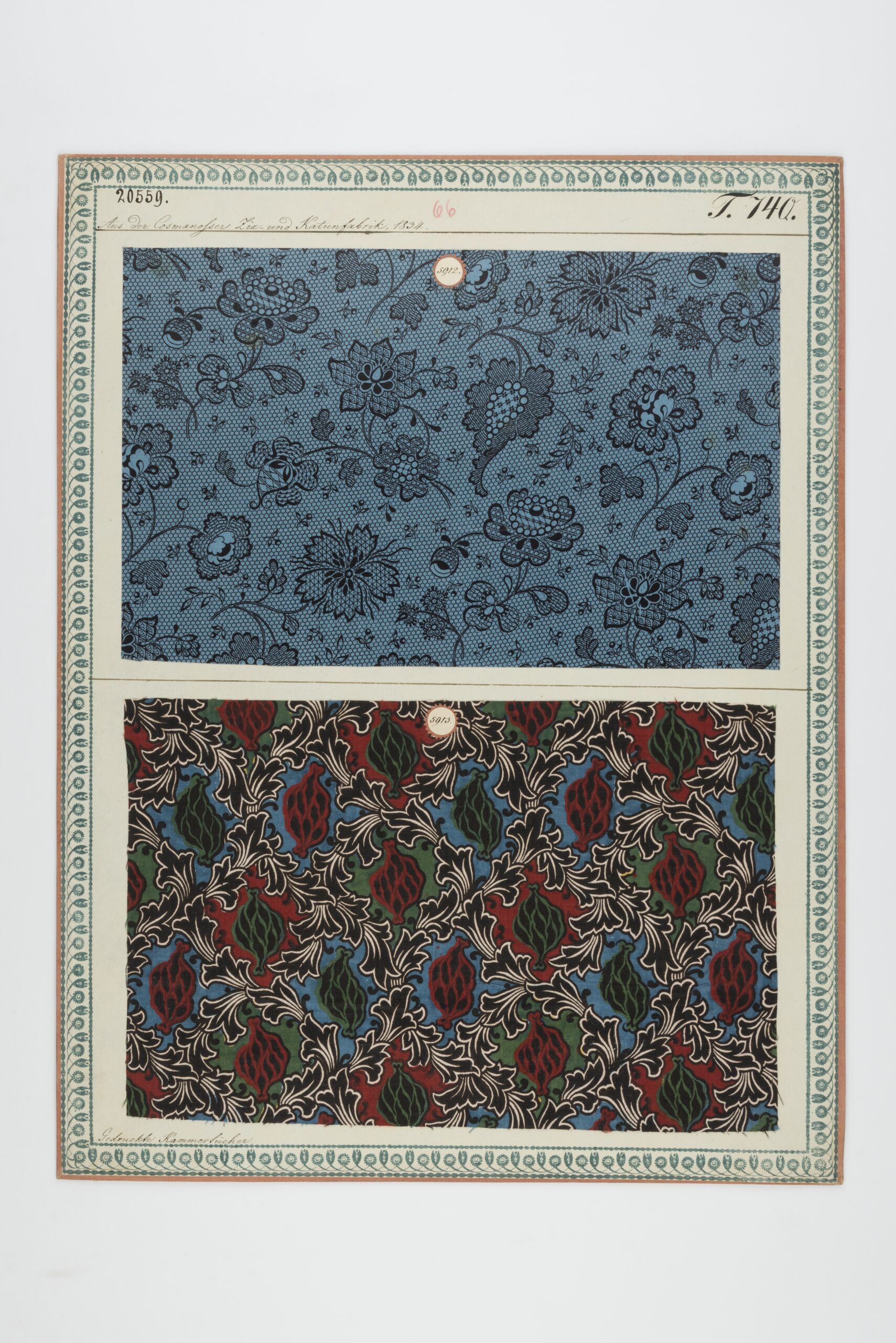 - Beschriftung (Vorderseite) : Aus der Cosmanosser Ziz- und Kattunfabrik, 1834. / Gedruckte Kammertücher.