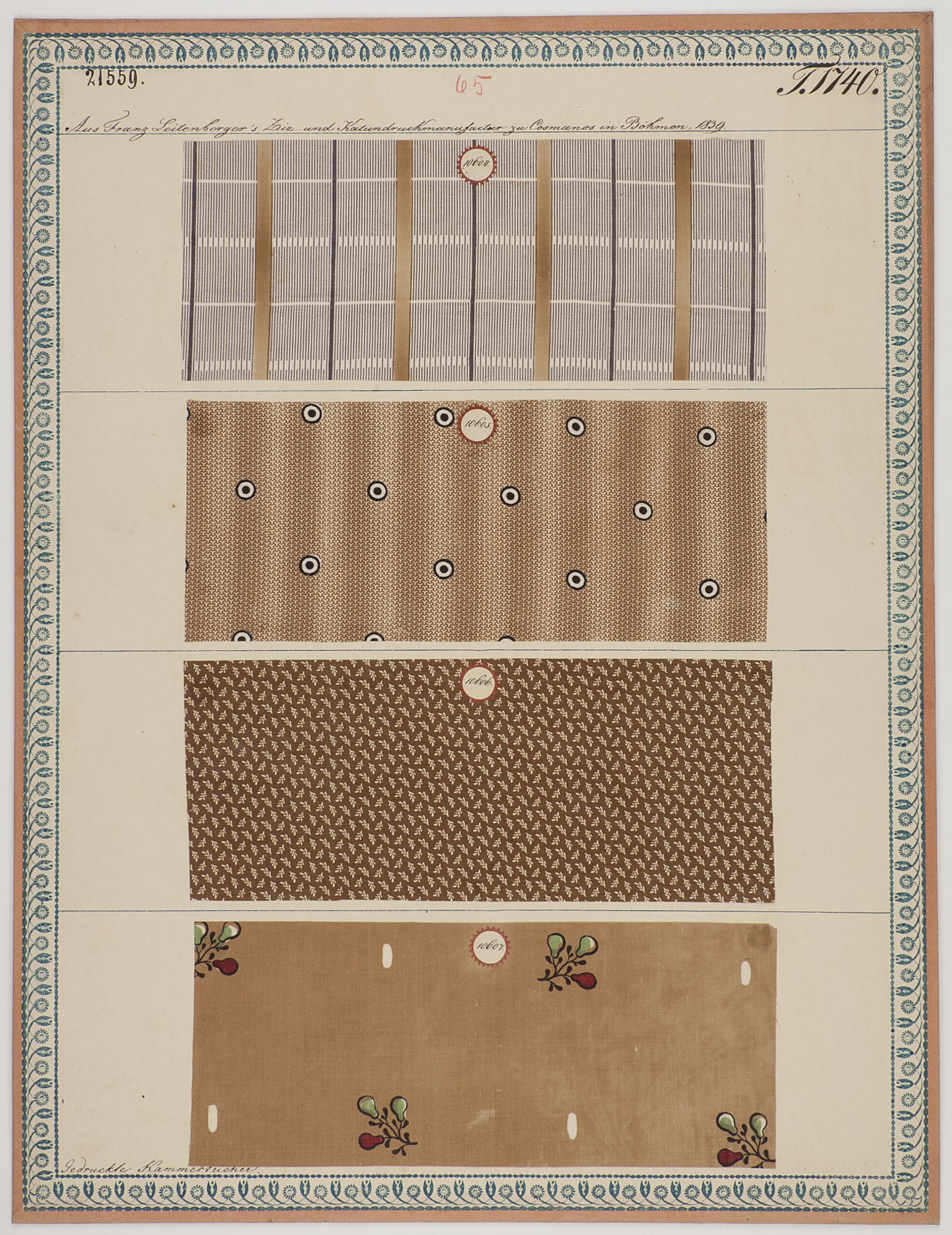 - Beschriftung (Vorderseite) : Aus Franz Leitenbergers Ziz- und Kattundruckmanufactur zu Cosmanos in Böhmen, 1839. / Gedruckte Kammertücher