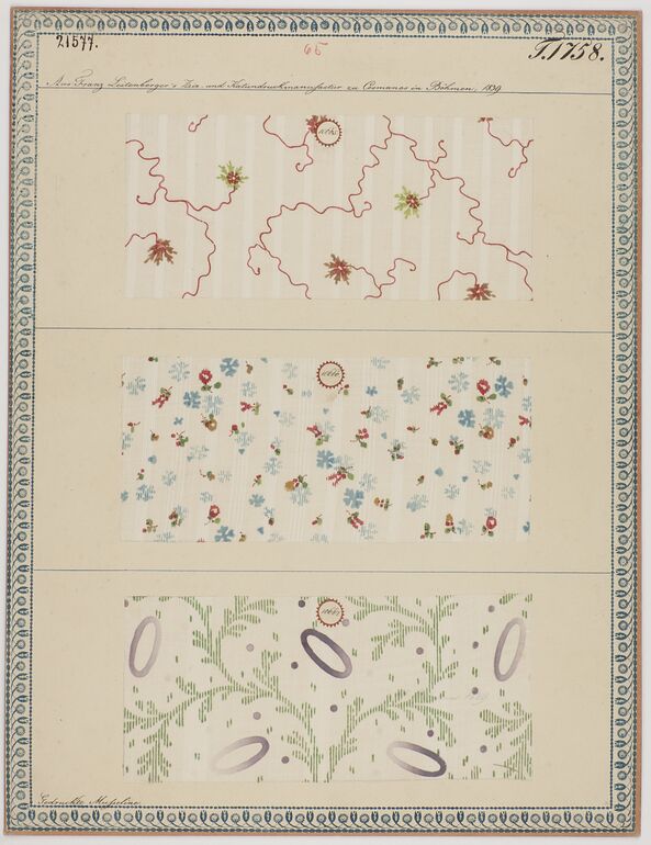 - Beschriftung (Vorderseite) : Aus Franz Leitenberger's Ziz- und Kattundruckmanufactur zu Cosmanos in Böhmen, 1839. / Gedruckte Kammertücher.