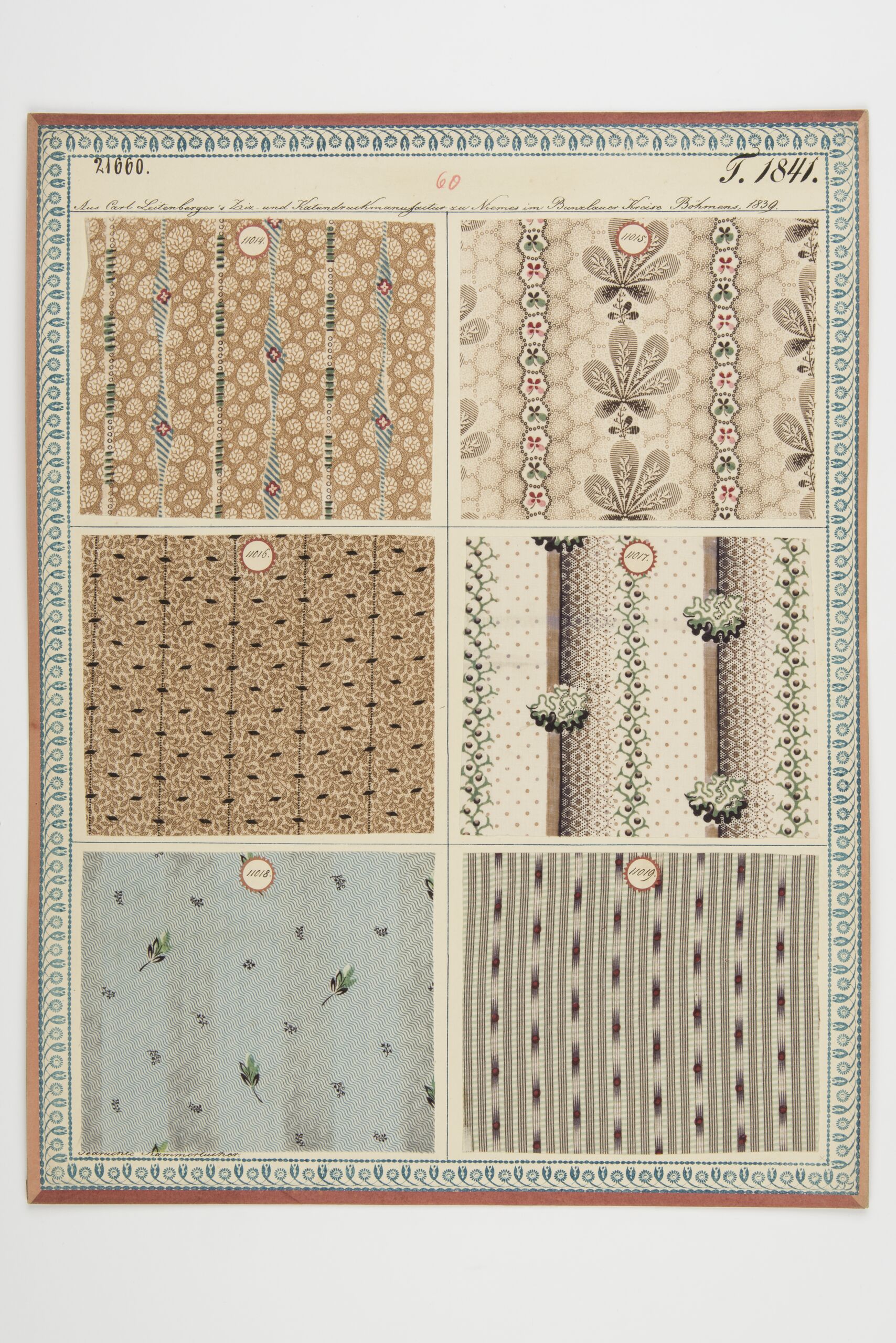 • Beschriftung (Vorderseite) : Aus Carl Leitenberger's Ziz- u. Kattundruckmanufactur zu Niemes im Bunzlauer Kreise, Böhmen, 1839. / Gedruckte Kammertücher.