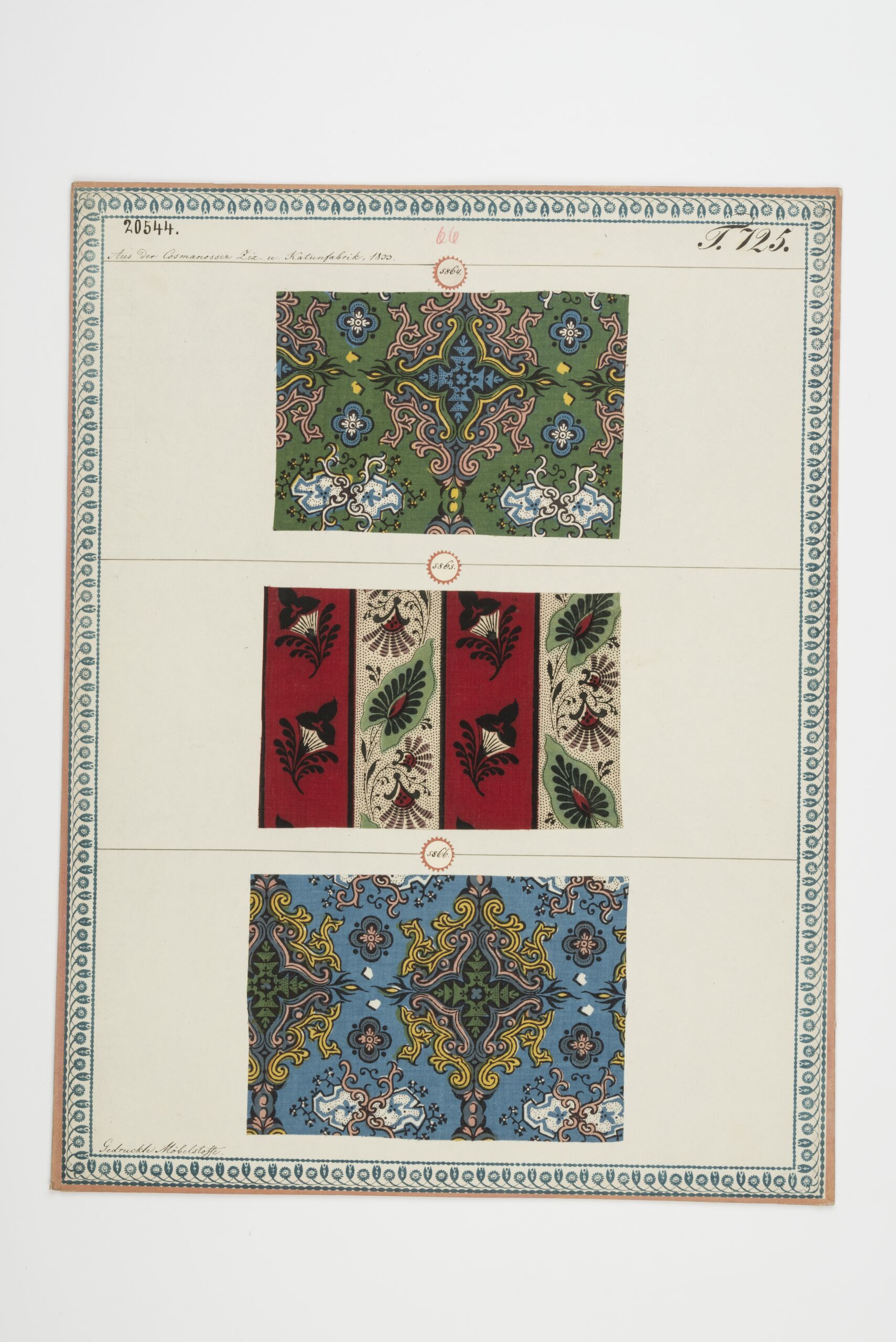 - Beschriftung (Vorderseite) : Aus der Cosmanosser Ziz- und Kattunfabrik, 1833. / Gedruckte Möbelstoffe.