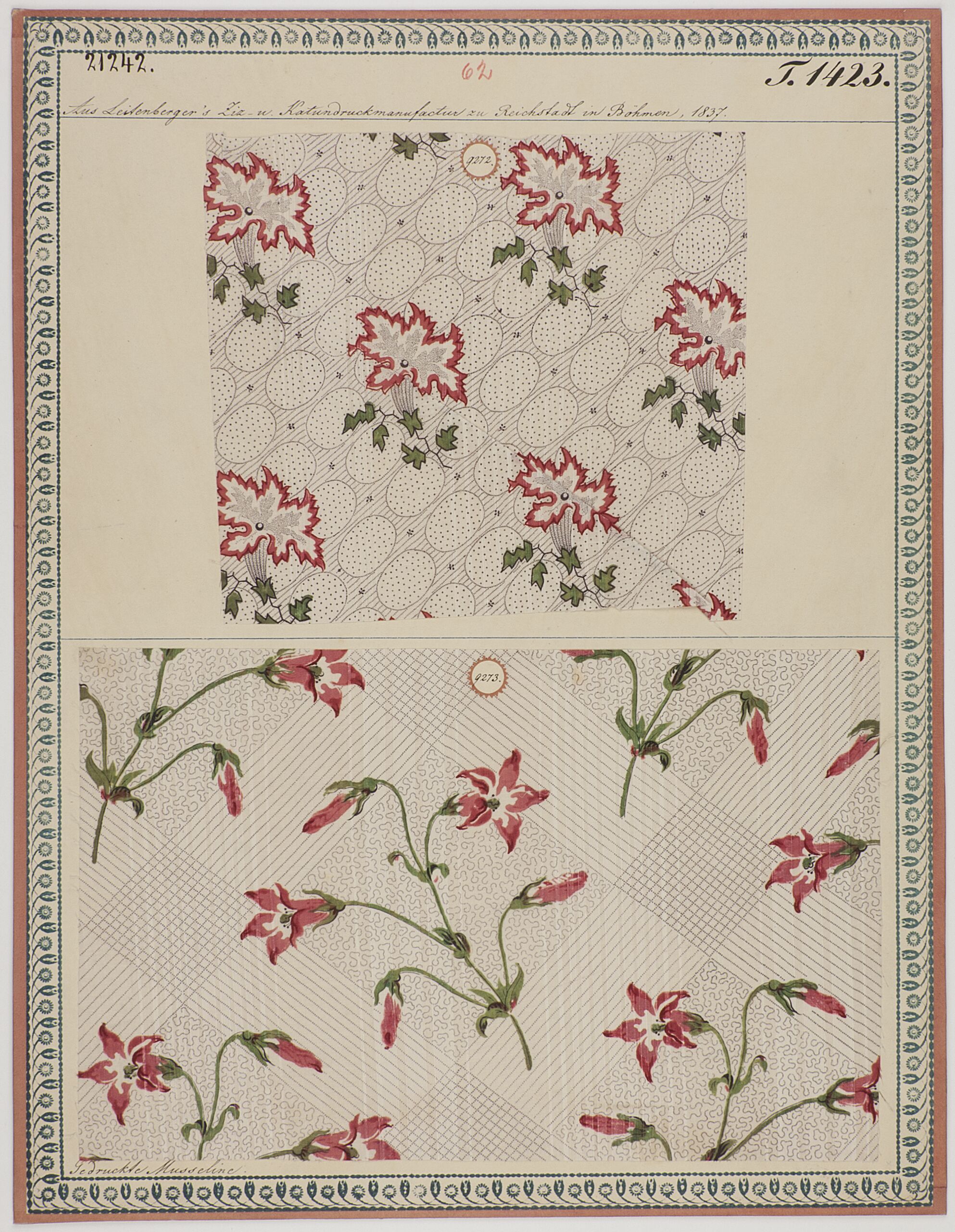 - Beschriftung (Vorderseite) : Aus Leitenberger's Ziz u. Kattundruckmanufactur zu Reichstadt in Böhmen, 1837. / Gedruckte Musseline.