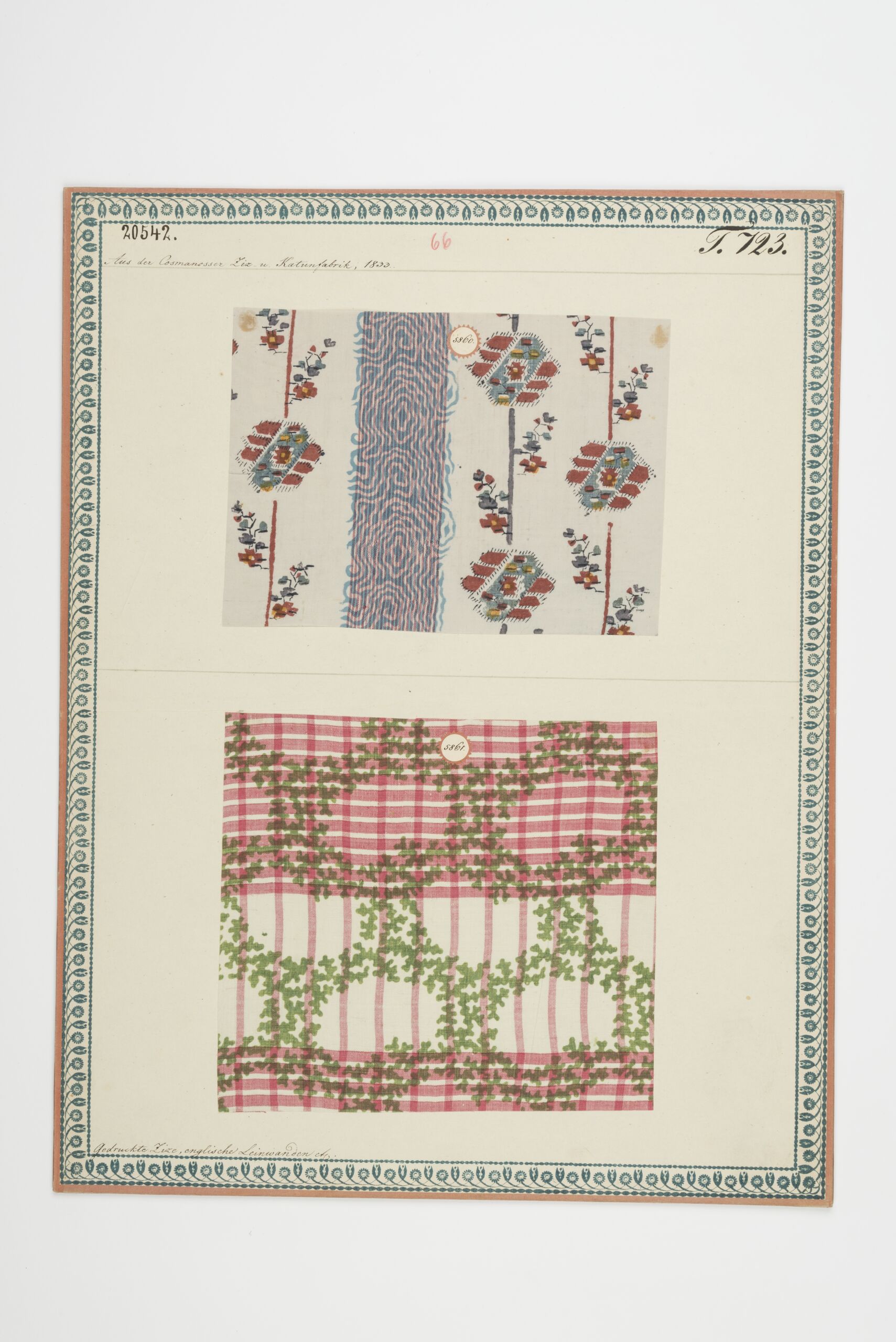 - Beschriftung (Vorderseite) : Aus der Cosmanosser Ziz- und Kattunfabrik, 1833. / Gedruckte Zize, englische Leinwanden etc.
