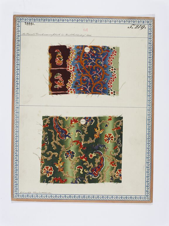 - Beschriftung (Vorderseite) : Aus der k.k. ärar. Wollenzeugmanufactur in Linz. / Aus der allgem. Gewerbsprod.-Ausstellung in Wien vom J. 1835. / Gedruckter Rosenkranz zu einem Tischteppich von Tuch.