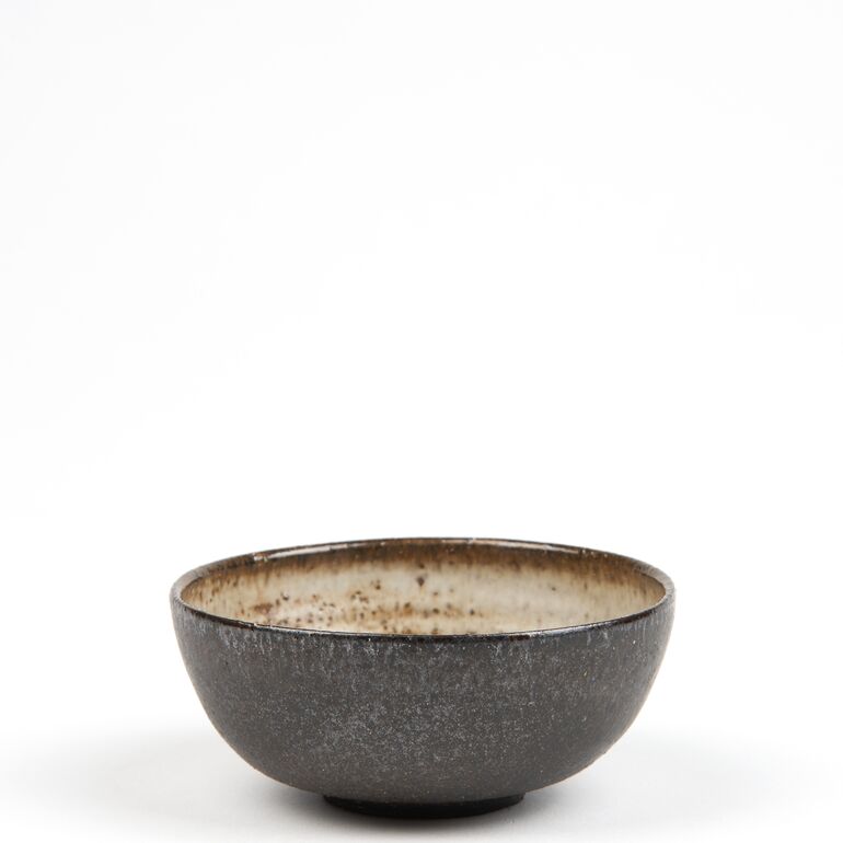 offenes Gefäß, in der Mitte und am Mundrand eingezogen. Außen hell-und dunkelbraun, innen weiß glasiert