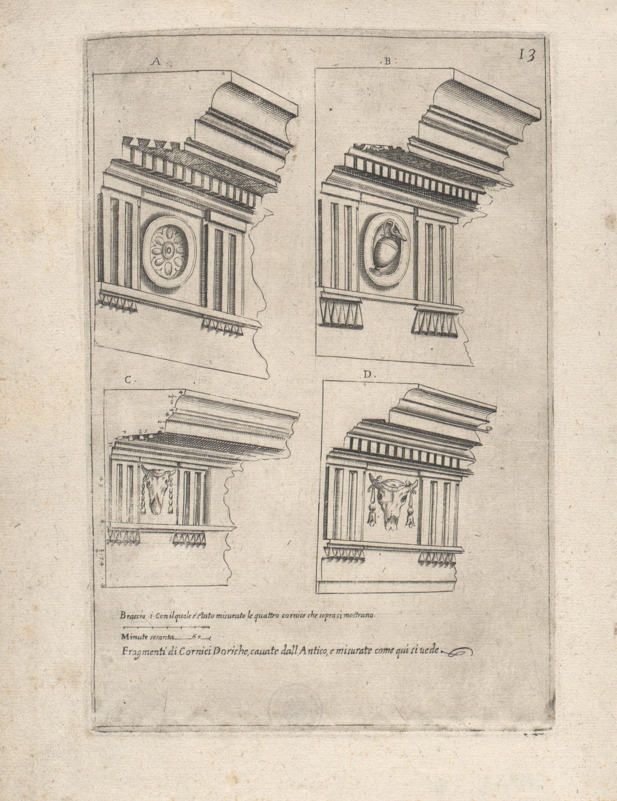 - Text am Objekt: Fragmenti di Cornici Doriche, cavate dall Antico, e misurate come qui si vede / ... / 13