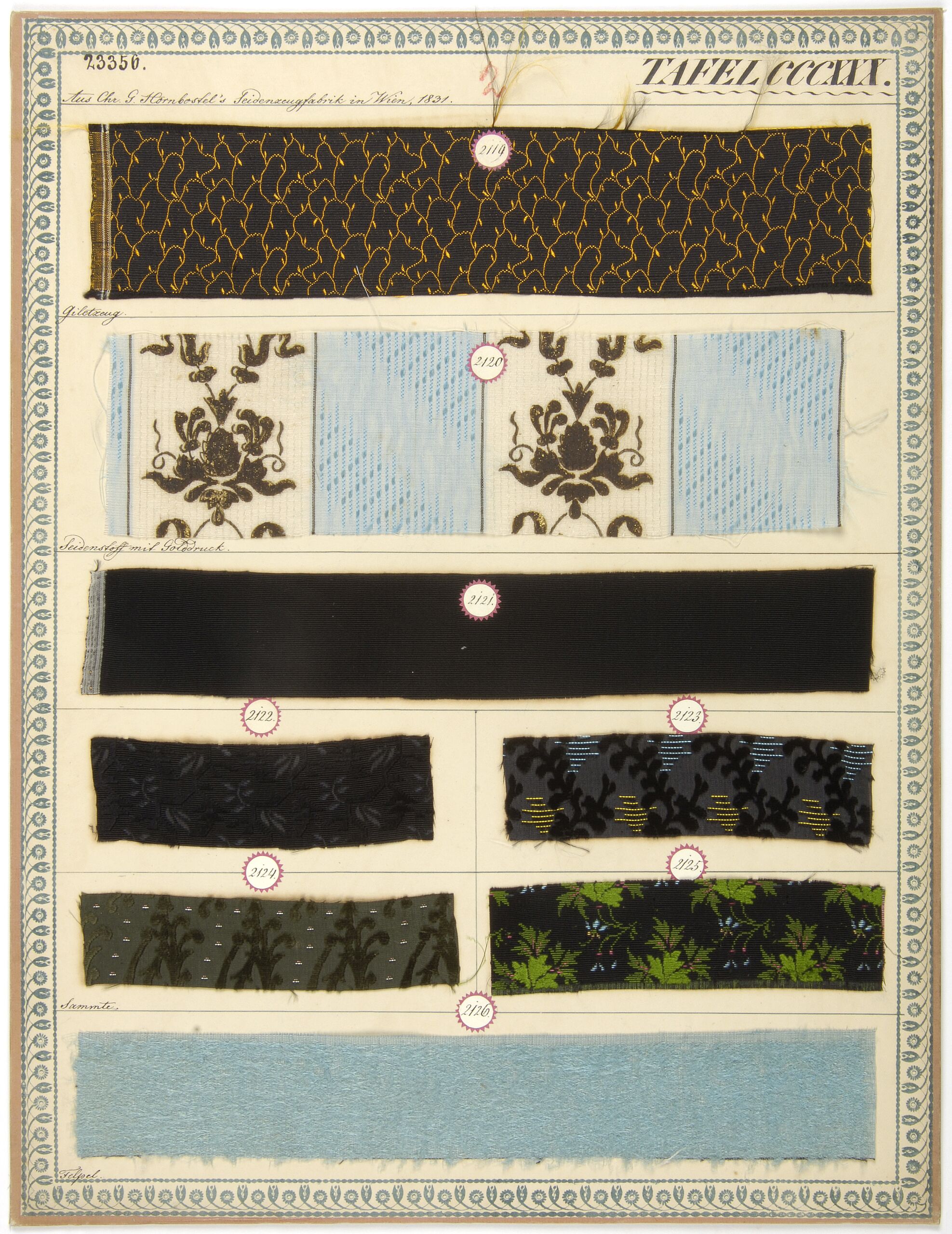 - Beschriftung (Vorderseite) : Aus Chr. G. Hornbostel's Seidenzeugfabrik in Wien, 1831. / Giletzeug. / Seidenstoff mit Golddruck. / Sammte. / Felpel.