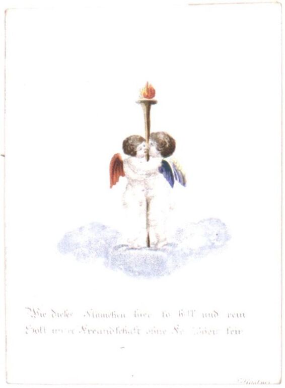 - Text am Objekt: [Auf der Urne:] DER [Auf dem Sockel:] Freund- / schaft [Links unten:] bei C. Vesco in Salzburg. [Rechts unten:] No. 130. [Mitte unten:] Wem treue freundschaft Blumen pflückt / Der lebt stets froh und hoch beglückt.