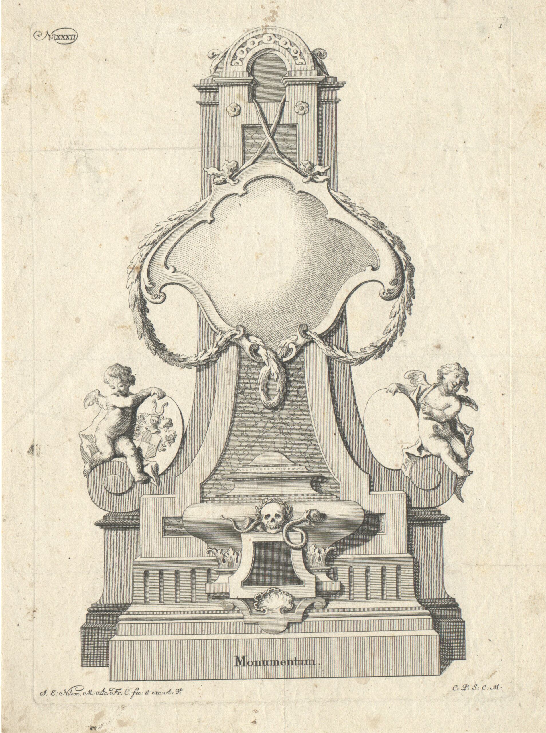 Ornamentstich, Grabmonument, Blatt 1 aus einer Folge, herausgegeben von J. E. Nilson, Verlagsnummer XXXII (32. Folge des von Nilson verlegten Reihenwerks mit 69 Folgen), Johannes Esaias Nilson, MAK Inv.nr. KI 1-484-1