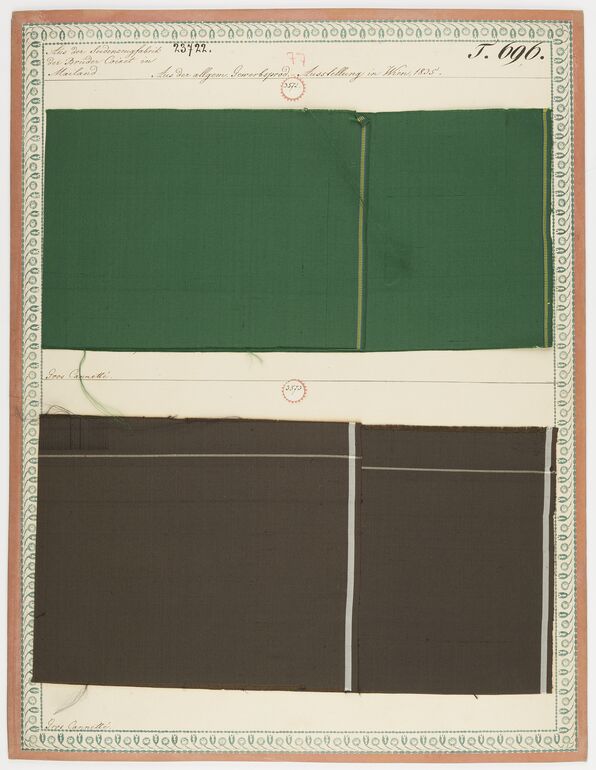 - Beschriftung (Vorderseite) : Aus der Seidenzeugfabrik der Brüder Coizet in Mailand. / Aus der allgem. Gewerbsprod.-Ausstellung in Wien, 1835. / Grosgrain. / Grosgrain.