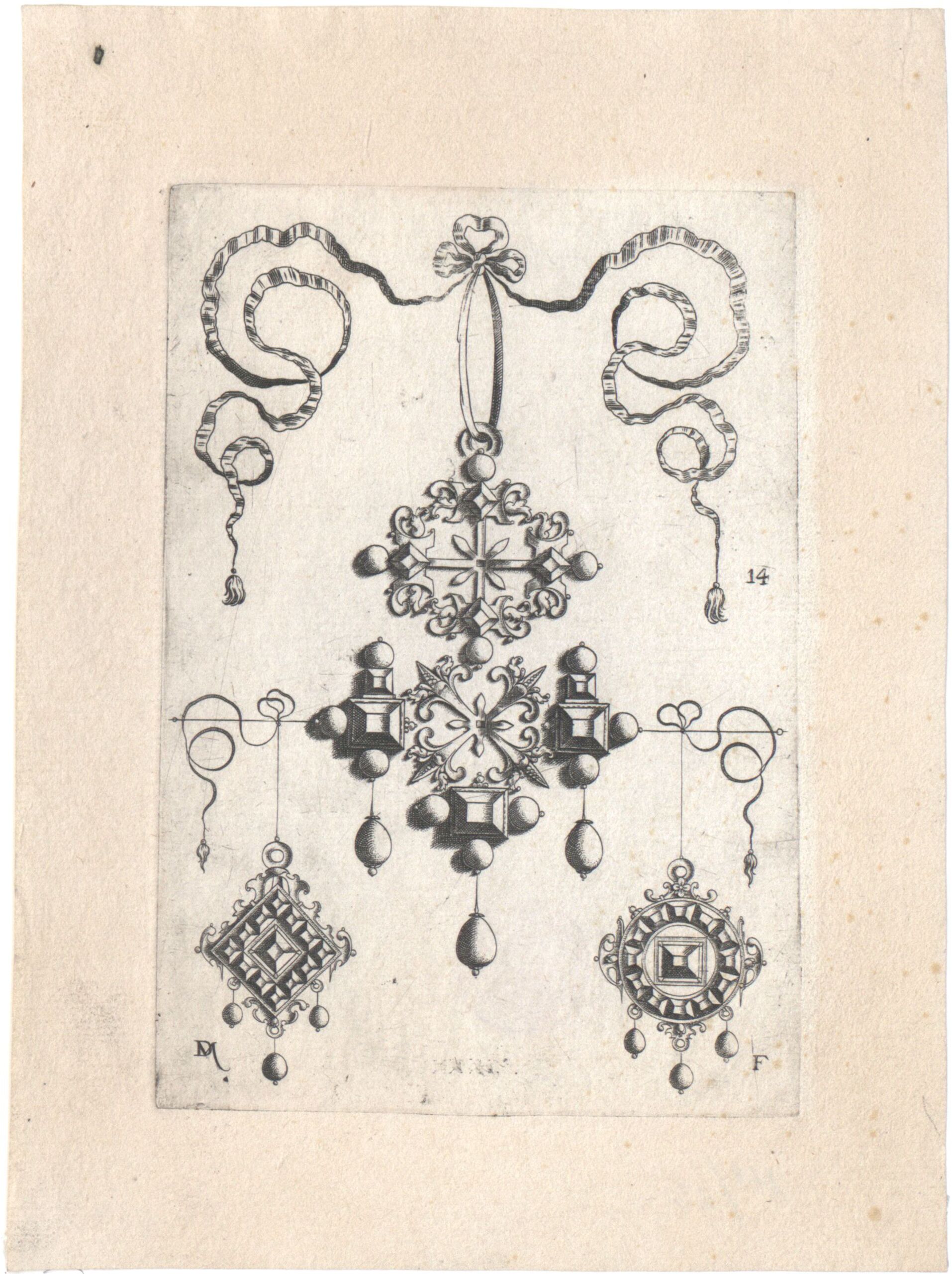 Ornamentstich, Großer Anhänger und zwei Ohrgehänge, Blatt 14 aus einer Folge von Goldschmiedearbeiten, bei der die ursprünglichen Nummern von Blättern aus vier Folgen (Hollstein 67- 81, 82- 84, 85- 97, 98- 100) entfernt wurden, die Blätter neu numeriert und gemeinsam herausgegeben wurden, Daniel Mignot, MAK Inv.nr. KI 1-303-14
