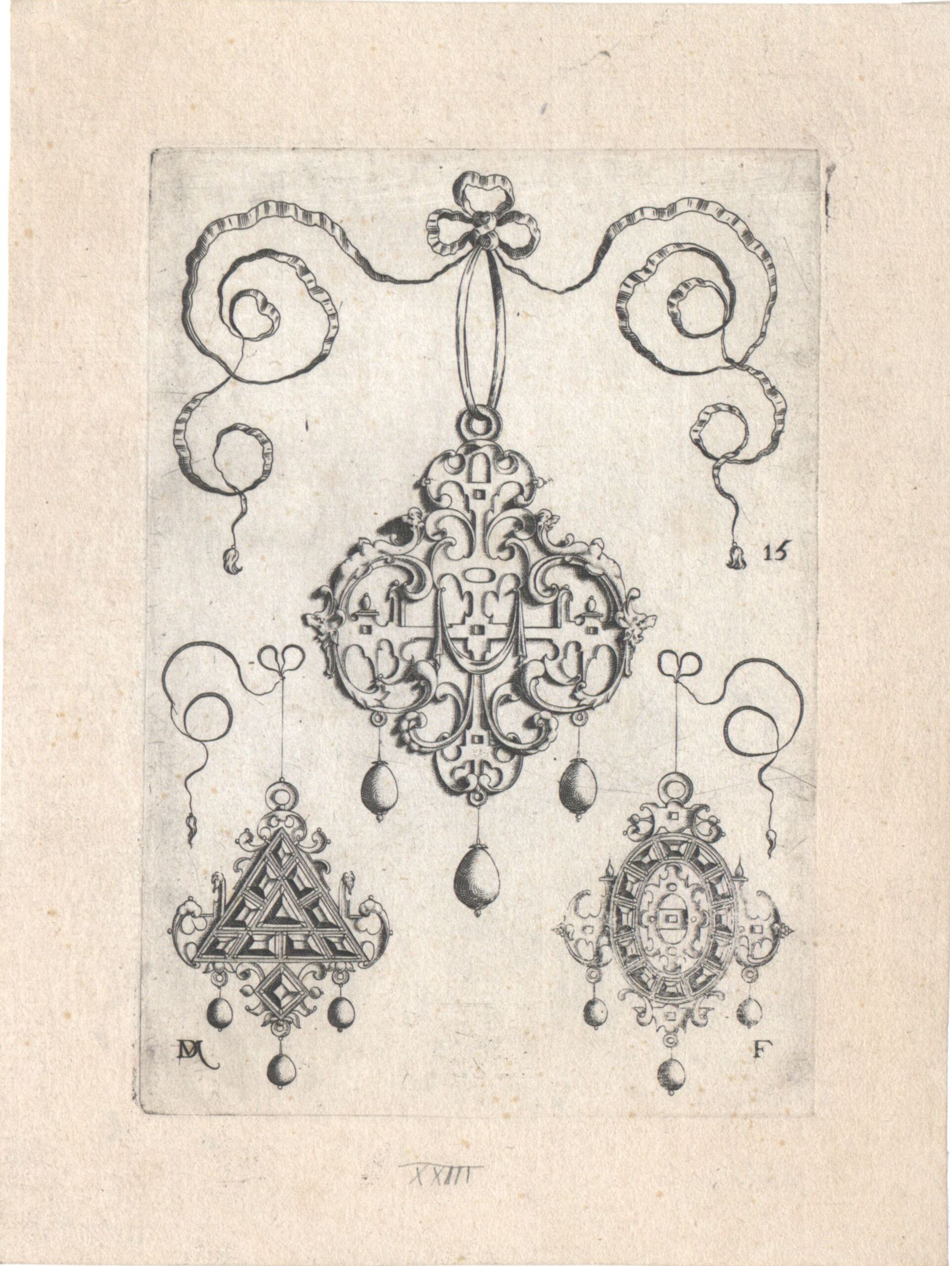 Ornamentstich, Großer Anhänger und zwei Ohrgehänge, Blatt 15 aus einer Folge von Goldschmiedearbeiten, bei der die ursprünglichen Nummern von Blättern aus vier Folgen (Hollstein 67- 81, 82- 84, 85- 97, 98- 100) entfernt wurden, die Blätter neu numeriert und gemeinsam herausgegeben wurden, Daniel Mignot, MAK Inv.nr. KI 1-303-15