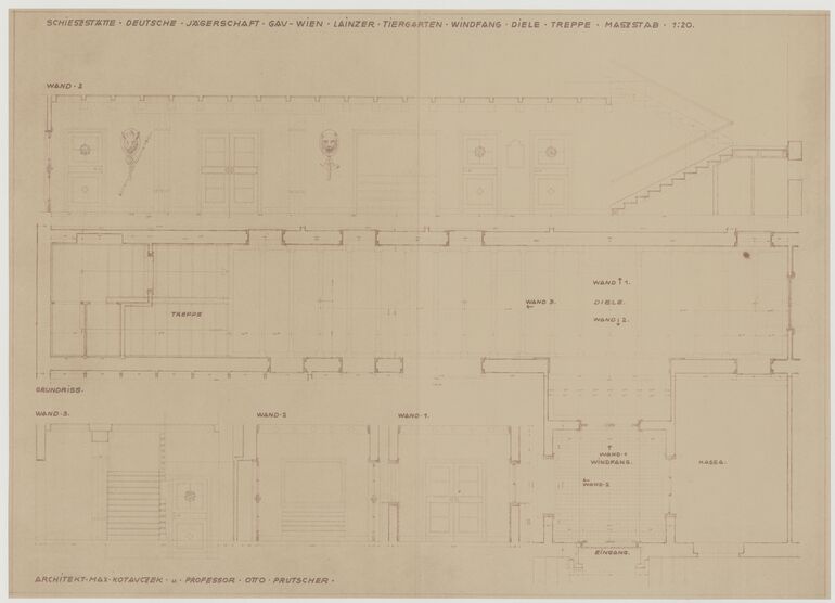 - Grundriss, Ansicht und Schnitt der Schieszstätte für die deutsche Jägerschaft im Lainzer Tiergarten (vom Bearbeiter vergebener Titel)