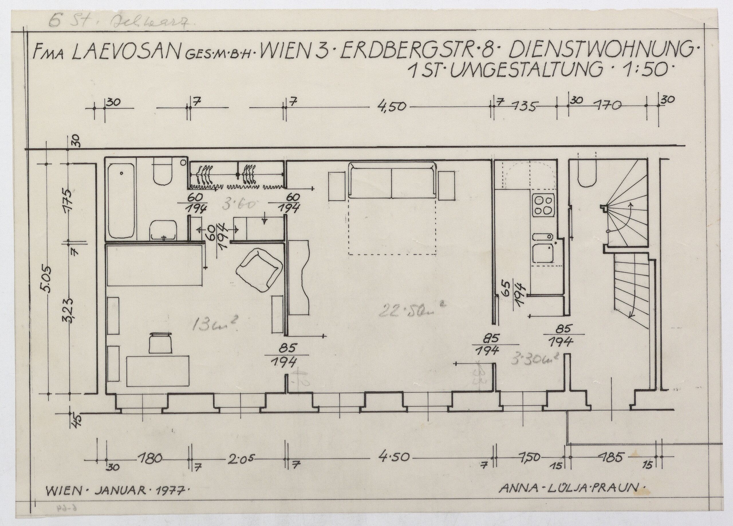 - Text am Objekt (oben) : FMA LAEVOSAN GES M B H WIEN 3 ERDBERGSTR 8 DIENSTWOHNUNG / 1ST UMGESTALTUNG 1:50