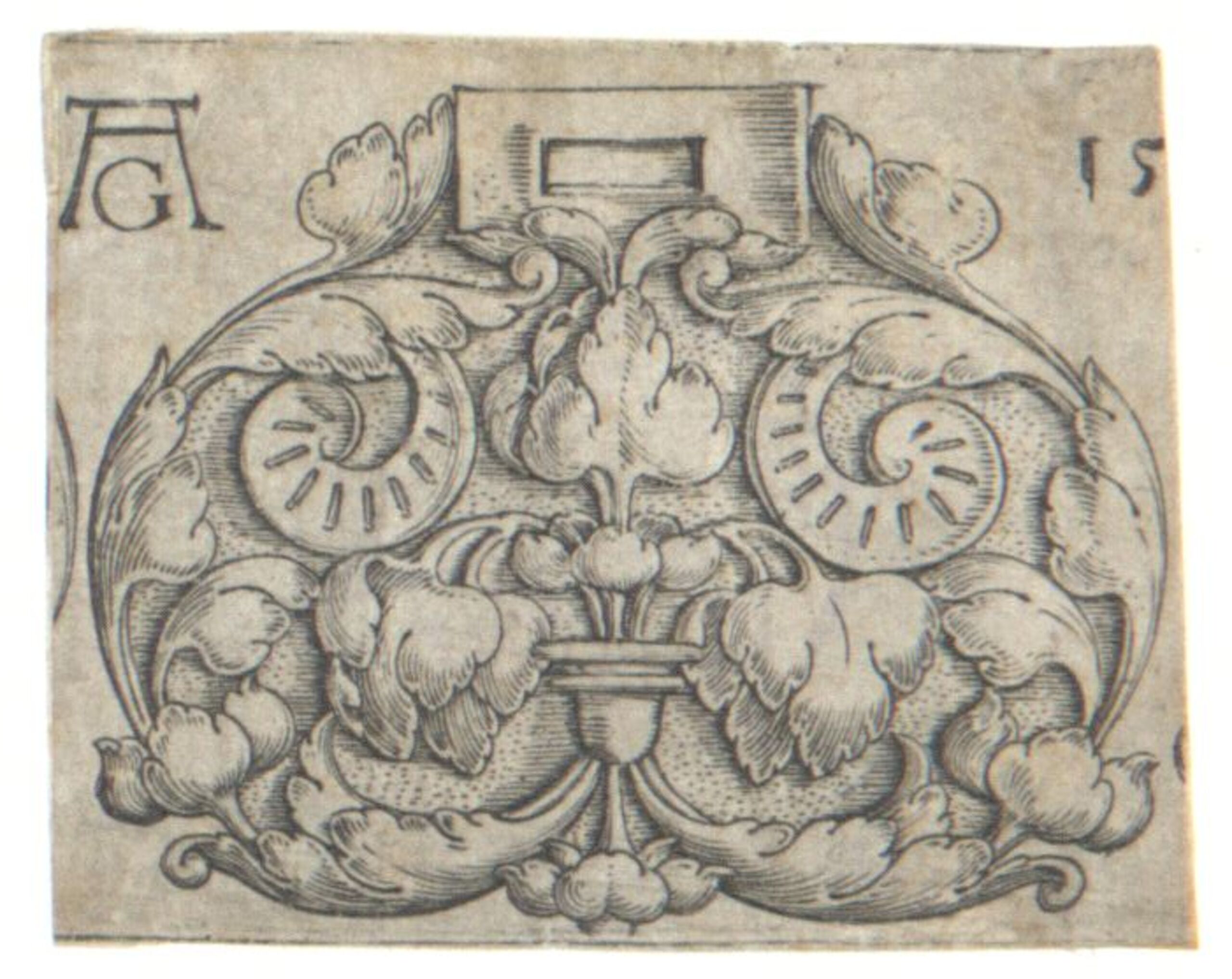Ornamentstich, Gürtelschnalle, aus einem Blatt mit drei Gürtelschnallen herausgeschnitten, für die Verwendung der Gürelschnalle siehe die Dame auf Blatt 6 der großen Hochzeitstänzer (B. 165), Heinrich Aldegrever, MAK Inv.nr. KI 1-25-1