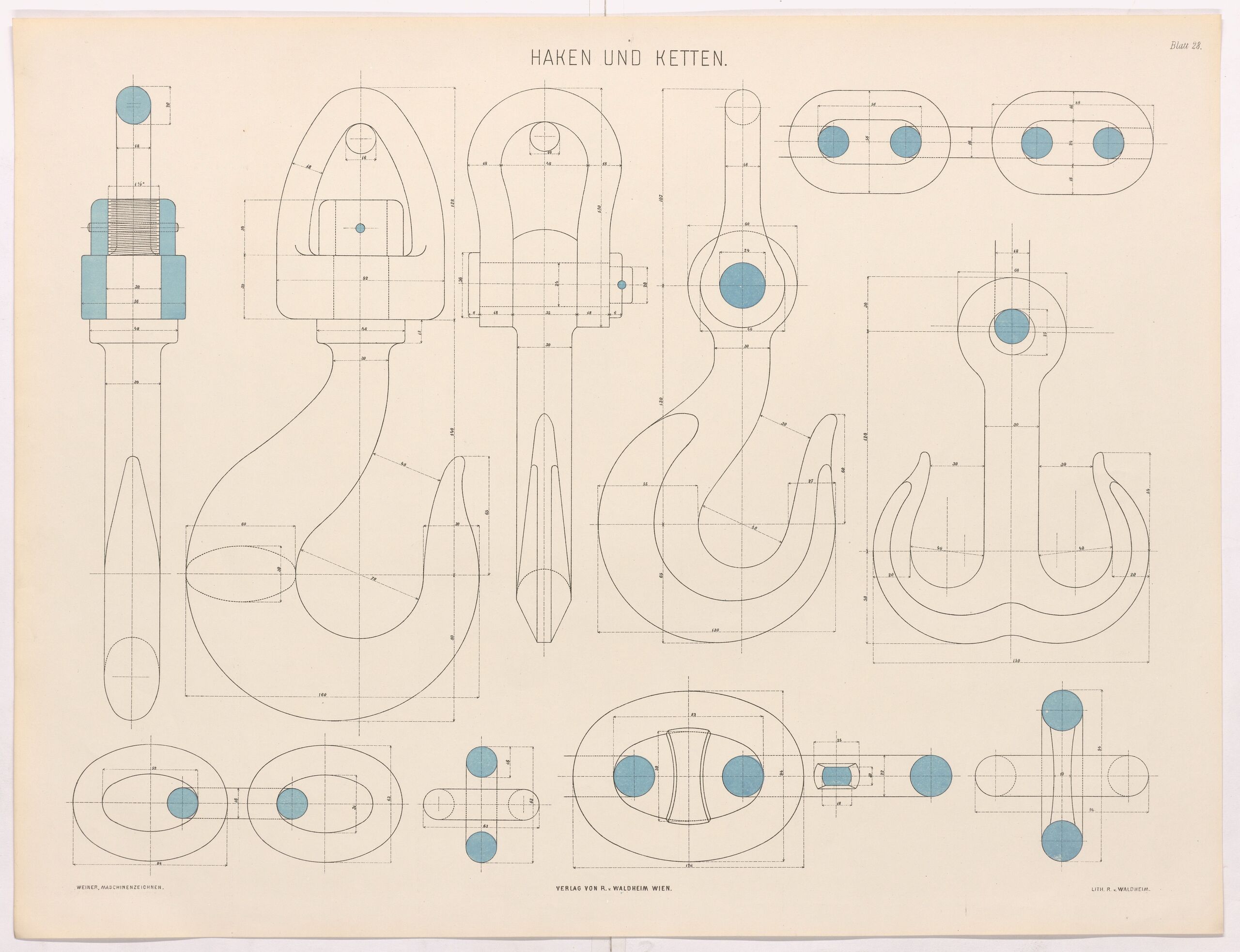- Text am Objekt: Blatt 28; Haken und Ketten.; Verlag von R. v. Waldheim in Wien.; WEINER, MASCHINENZEICHNEN; LITH v. R. v. WALDHEIM.
