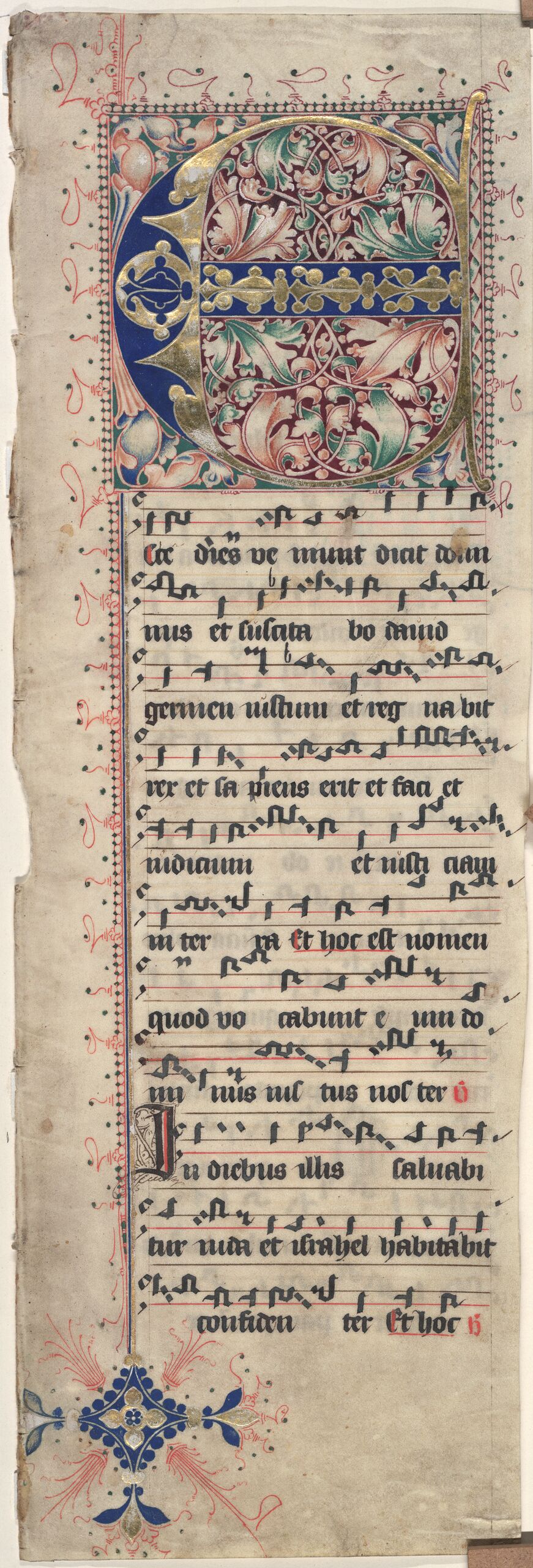 Teil eines Blattes einer Missale mit großer Filigraninitiale des Buchstabens "E". Darunter wechseln Textur und Notation die Zeilen, wobei es sich um Hufnagelschrift auf vier Linien handelt. Die prunkvolle Filigraninitiale über zehn Zeilen ist im Binnenfeld sowie in den Zwickeln mit einem dichten Ranken- und Blütenwerk geschmückt. Der Körper ist dagegen mit ornamentalen Goldauflagen auf blauem Grund geschmückt. Der Filigranschmuck besteht aus üppigem Blattwerk, das durch Überschneidungen, Einrollungen und Weißhöhung sehr räumlich wirkt. Um den Rahmen der Initiale verlaufen Perlenstäbe, die zusammen mit sehr reduziertem Fleuronnée auch die Randleiste zieren und am unteren Ende noch ein Blütenornament samt Fädenbündel bilden. Auf dem Verso ist eine weitere Initiale in Rot und Blau über vier Zeilen, die das dieser Serie bestimmende Blattmuster im Binnenfeld trägt. Dazu kommen zwei zweizeilige Lombarden der Buchstaben "H" und "D".