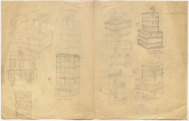 Entwurf, Hausgerät zum Zwecke der Wiederbesiedlung kriegsbetroffener Gebiete. Küchenschrank mit Mehllade. Küchenbank mit Holzlege, Karl Prömmel, MAK Inv.nr. KI 23414-12
