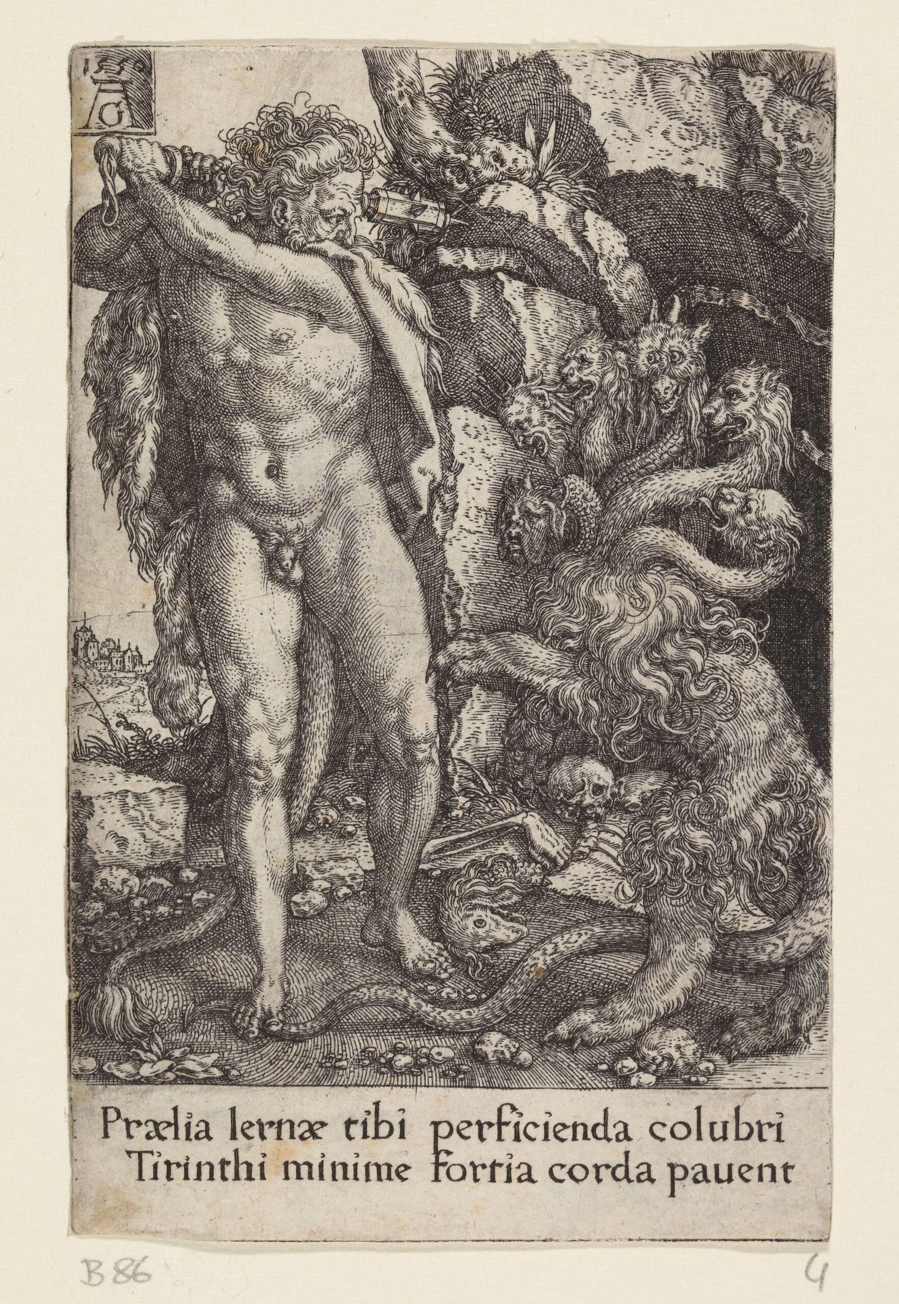 - Text am Objekt: 1550 / Monogramm AG / Praelia lernae tibi perficienda colubri/ Tirinthi minime fortia corda pavent / handschriftlich auf der Rückseite: F. Lawet 1820