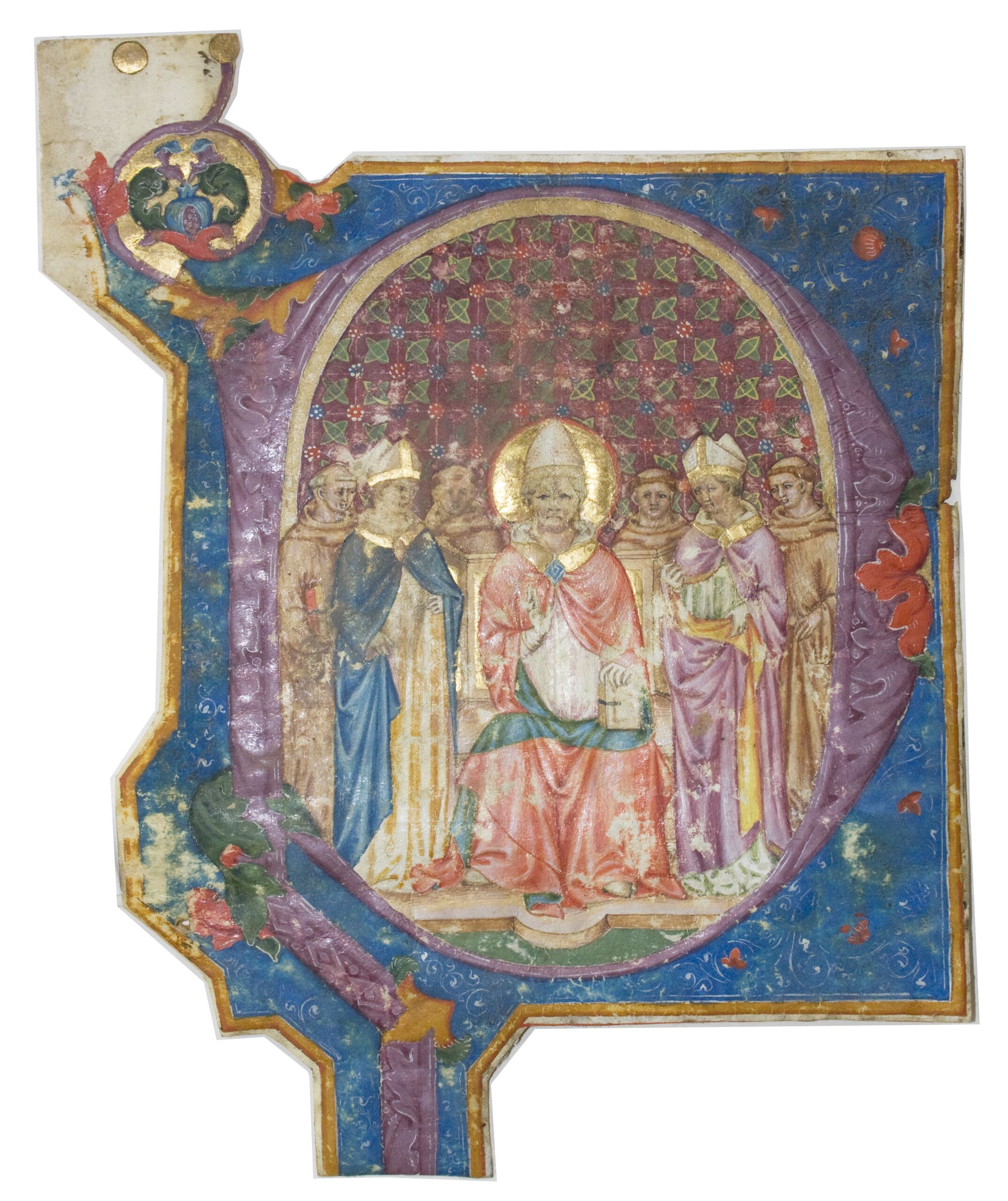 Historisierte Initiale aus einer Handschrift mit dem Buchstaben "D" sowie einer Gemeinschaft von Bischöfen und Geistlichen darin integriert. Der Initialkörper besteht aus violetten Akanthusranken und ist auf blauem Grund mit filigraner Rankenornamentik in Deckweiß und kleinen Blütenornamenten in Rot. Das Bildfeld ist auf violettem Grund mit verschiedenfarbiger Ornamentik und zeigt einen sitzenden Bischof mit stehenden Geistlichen sowie Mönchen dahinter. An der Seite gehen von der Initiale einige eingerollte Akanthusranken ab und gehen in die Randleiste über.
