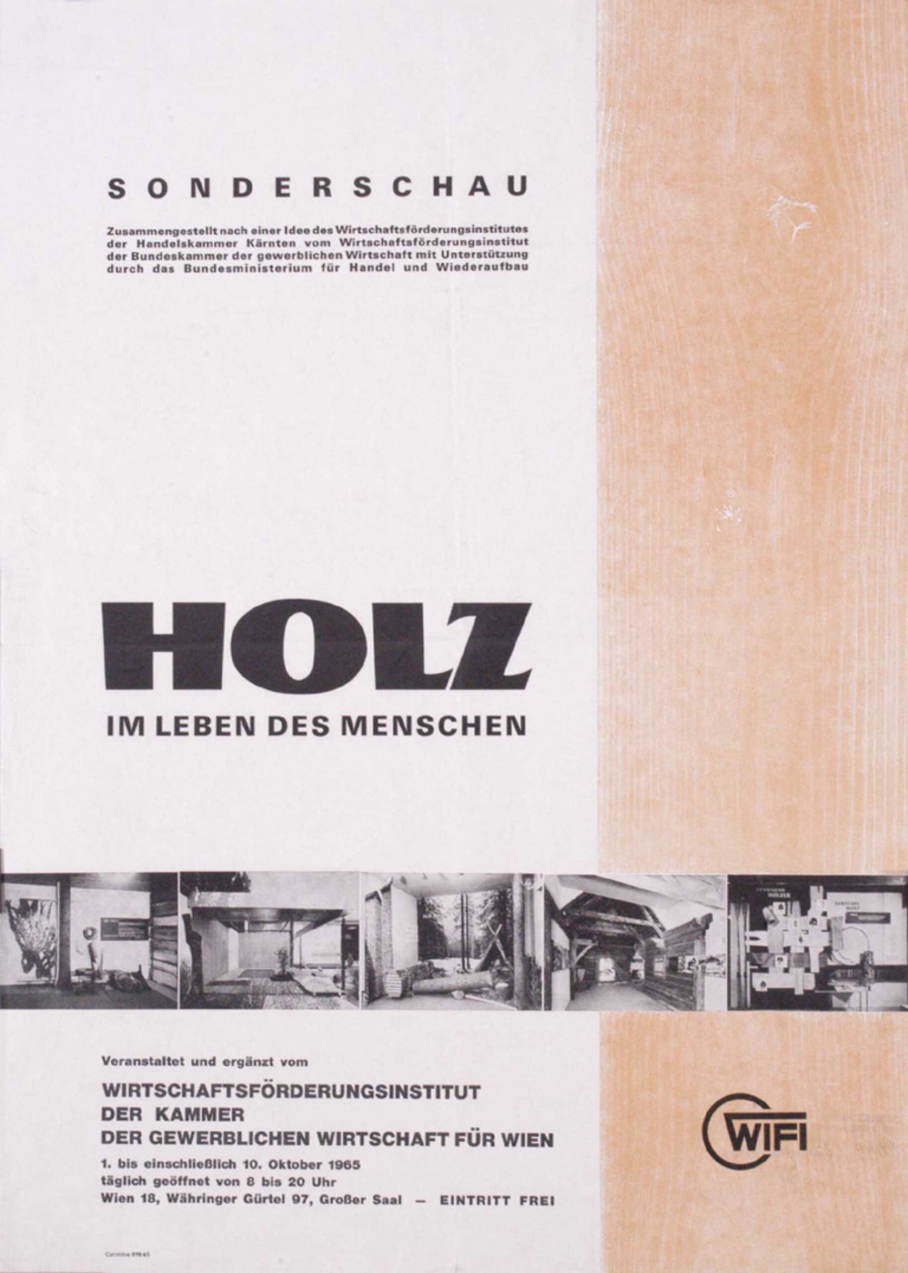 - Text am Objekt: Holz im Leben des Menschen. Sonderschau. 1. bis einschließlich 10. Oktober 1965. WIFI Wien, Währingergürtel 97, Großer Saal