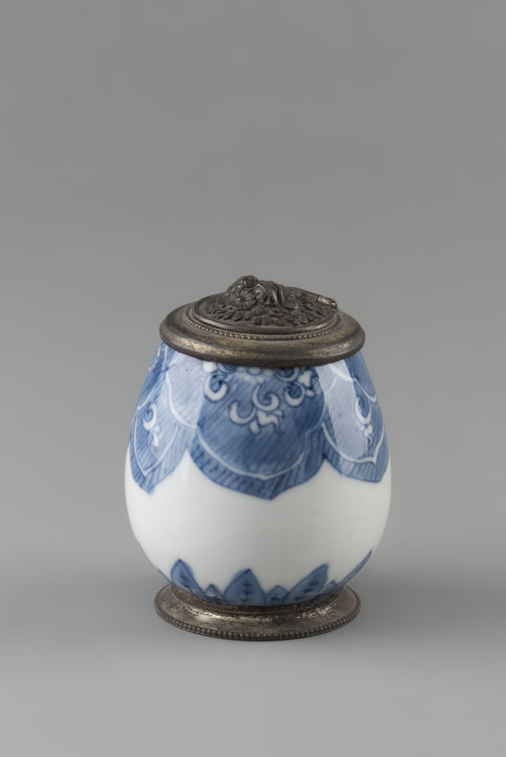 - Indigobehälter, Teil eines Schreibsets, mit Metallmontierung, Bodenmarke yü (Jade)