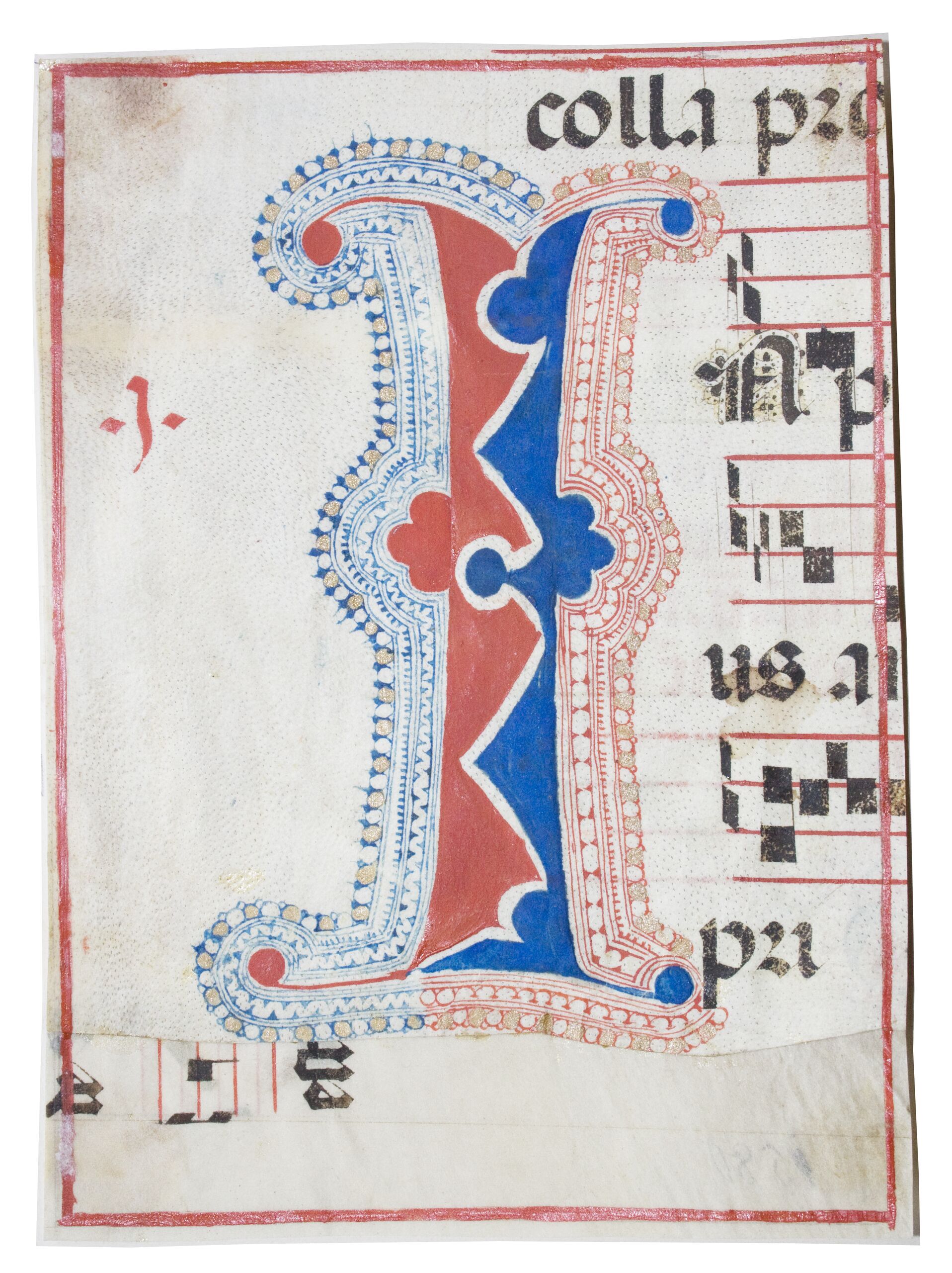 Teil eines Blattes einer Handschrift mit ausgeschnittener Initiale des Buchstabens "I". Die Initiale verläuft über sechs Zeilen, wobei diese im Wechsel von Textur und Notation angelegt sind und es sich um Quadratnotation auf vier roten Linien handelt. Die Initiale ist in Rot und Blau mit Aussparungen ornamentiert und wird von Flecht- und Perlenbändern mit teilweiser Vergoldung gerahmt.