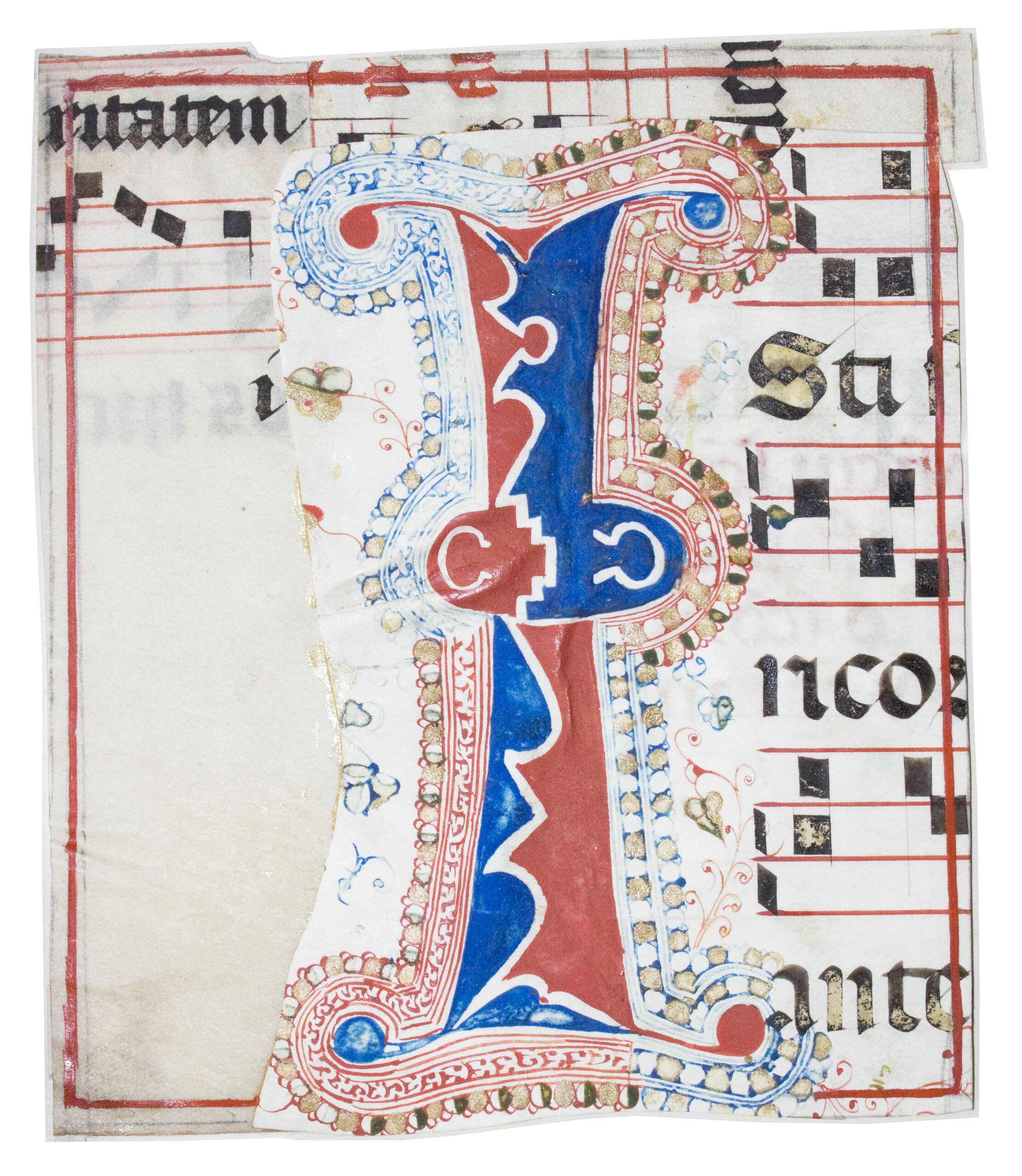 Teil eines Blattes einer Handschrift mit ausgeschnittener Initiale des Buchstabens "I". Die Initiale verläuft über sechs Zeilen, wobei diese im Wechsel von Textur und Notation angelegt sind und es sich um Quadratnotation auf vier roten Linien handelt. Die Initiale ist in Rot und Blau mit Aussparungen ornamentiert und wird von Flecht- und Perlenbändern mit teilweiser Vergoldung gerahmt.