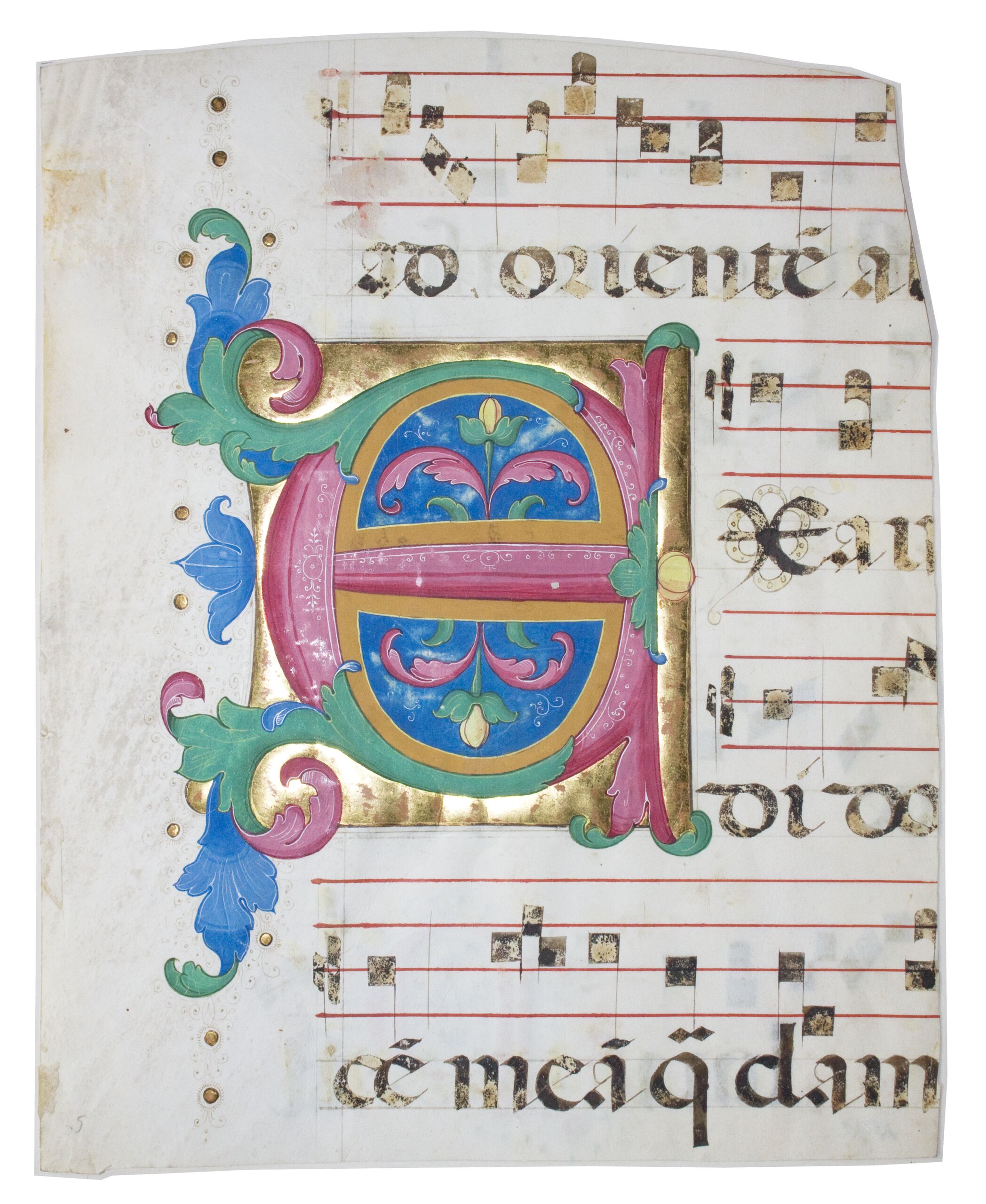Teil eines Blattes einer Handschrift mit ausgeschnittener Initiale des Buchstabens "E". Die Initiale verläuft über vier Zeilen, wobei diese im Wechsel von Textur und Notation angelegt sind und es sich um Quadratnotation auf vier roten Linien handelt. Der Körper der Initiale ist in Rosa ausgeführt und wird von Ranken in Rosa, Blau und Grün geschmückt. In den orange gerahmten Binnenfeldern sind stilisierte Blüten- und Blattornamente auf blauem Grund, während die Initiale außen von Goldgrund umgeben wird. Über die Ornamente verläuft eine filigrane Deckweißornamentik. Links am Rand gehen Teile der Ranken in die Randleiste über und werden zusätzlich von einer blauen Blüte und Goldpunkten mit Filigranornamentik flankiert. Auf dem Verso zusätzlich eine Lombarde des Buchstabens "P" in Rot mit blauem Ornament- und Perlenschmuck.