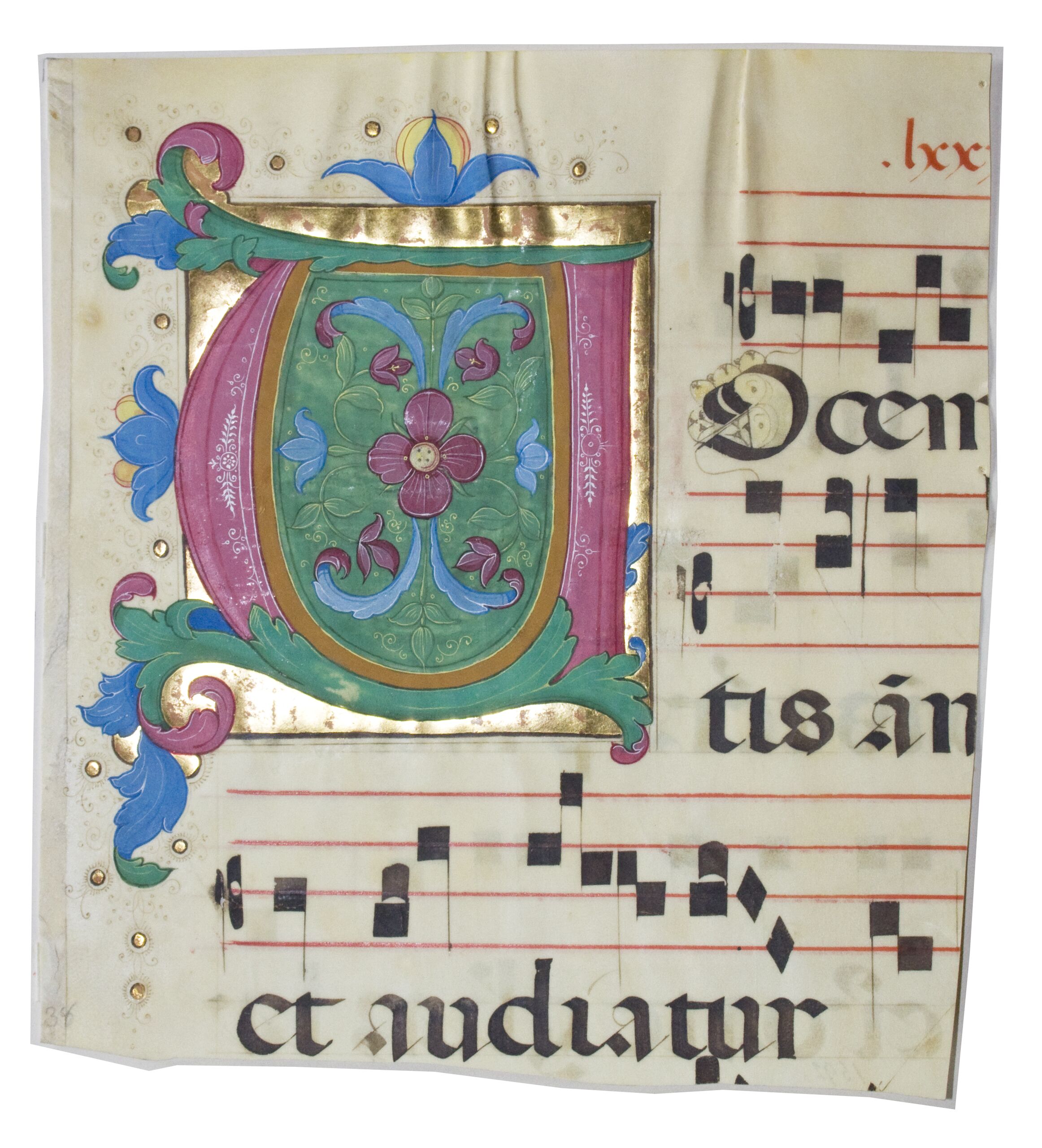 Teil eines Blattes einer Handschrift mit ausgeschnittener Initiale des Buchstabens "V". Die Initiale verläuft über vier Zeilen, wobei diese im Wechsel von Textur und Notation angelegt sind und es sich um Quadratnotation auf vier roten Linien handelt. Der Körper der Initiale ist in Rosa ausgeführt und wird von Ranken in Rosa, Blau und Grün geschmückt. Im braun gerahmten Binnenfeld ist ein Blüten- und Blattornament auf grünem Grund, während die Initiale außen von Goldgrund umgeben wird. Über die Ornamente verläuft eine filigrane Deckweißornamentik. Links am Rand gehen Teile der Ranken in die Randleiste über und werden von zwei blauen Blüten sowie Goldpunkten mit Filigranornamentik flankiert. Auf dem Verso ist zusätzlich eine Lombarde des Buchstabens "I" in Blau mit rotem Ornament- und Perlenschmuck.