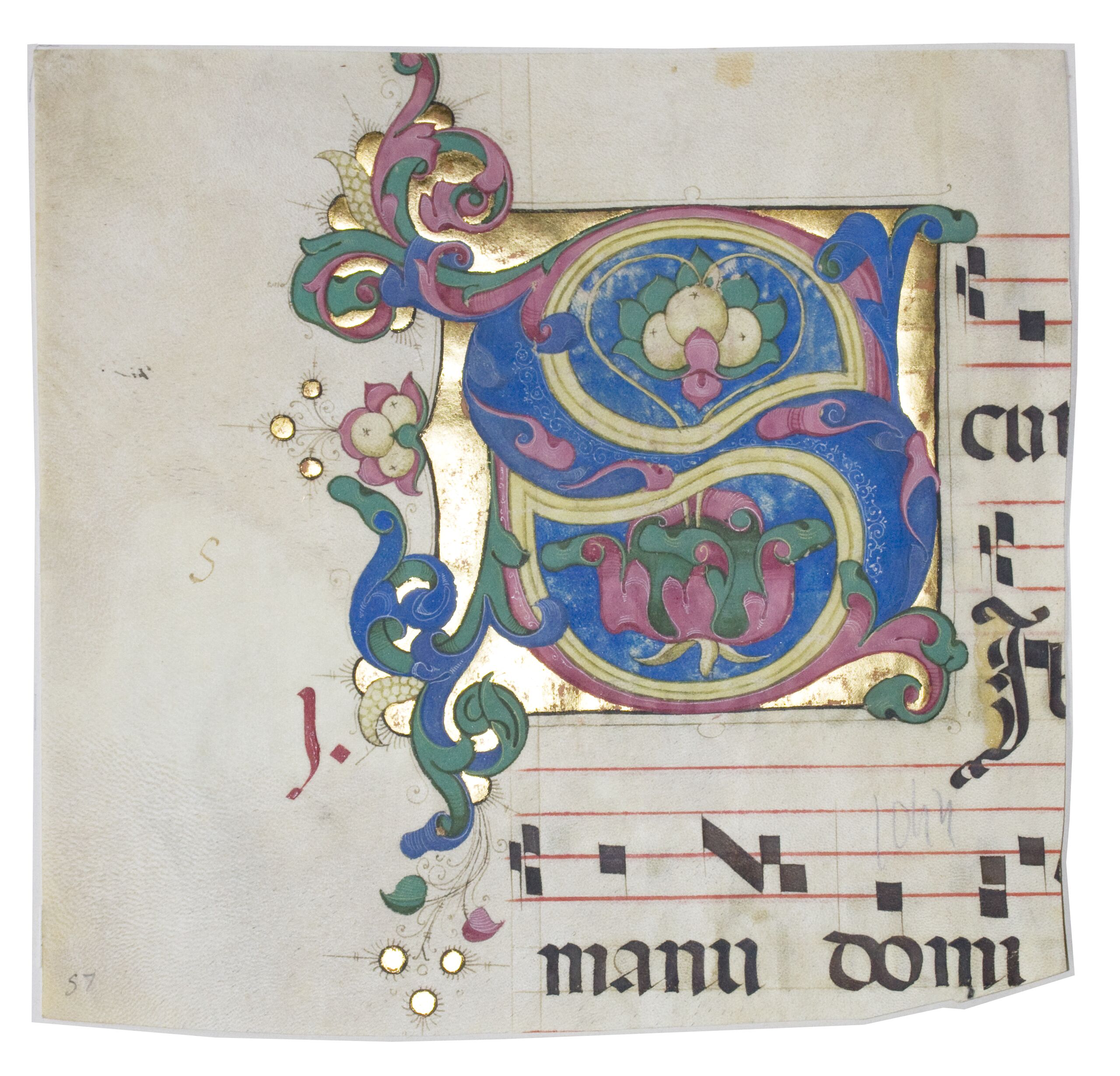Teil eines Blattes einer Handschrift mit ausgeschnittener Initiale des Buchstabens "S". Die Initiale verläuft über vier Zeilen, wobei diese im Wechsel von Textur und Notation angelegt sind und es sich um Quadratnotation auf vier roten Linien handelt. Der Körper der Initiale ist in Blau ausgeführt und wird von Ranken in Rosa, Blau und Grün geschmückt. In den gelb gerahmten Binnenfeldern sind Blüten- und Blattornamente auf blauem Grund, während die Initiale außen von Goldgrund umgeben wird. Über die Ornamente verläuft eine filigrane Deckweißornamentik. Links am Rand gehen Teile der Ranken in die Randleiste über und werden von Goldpunkten mit Filigranornamentik flankiert.