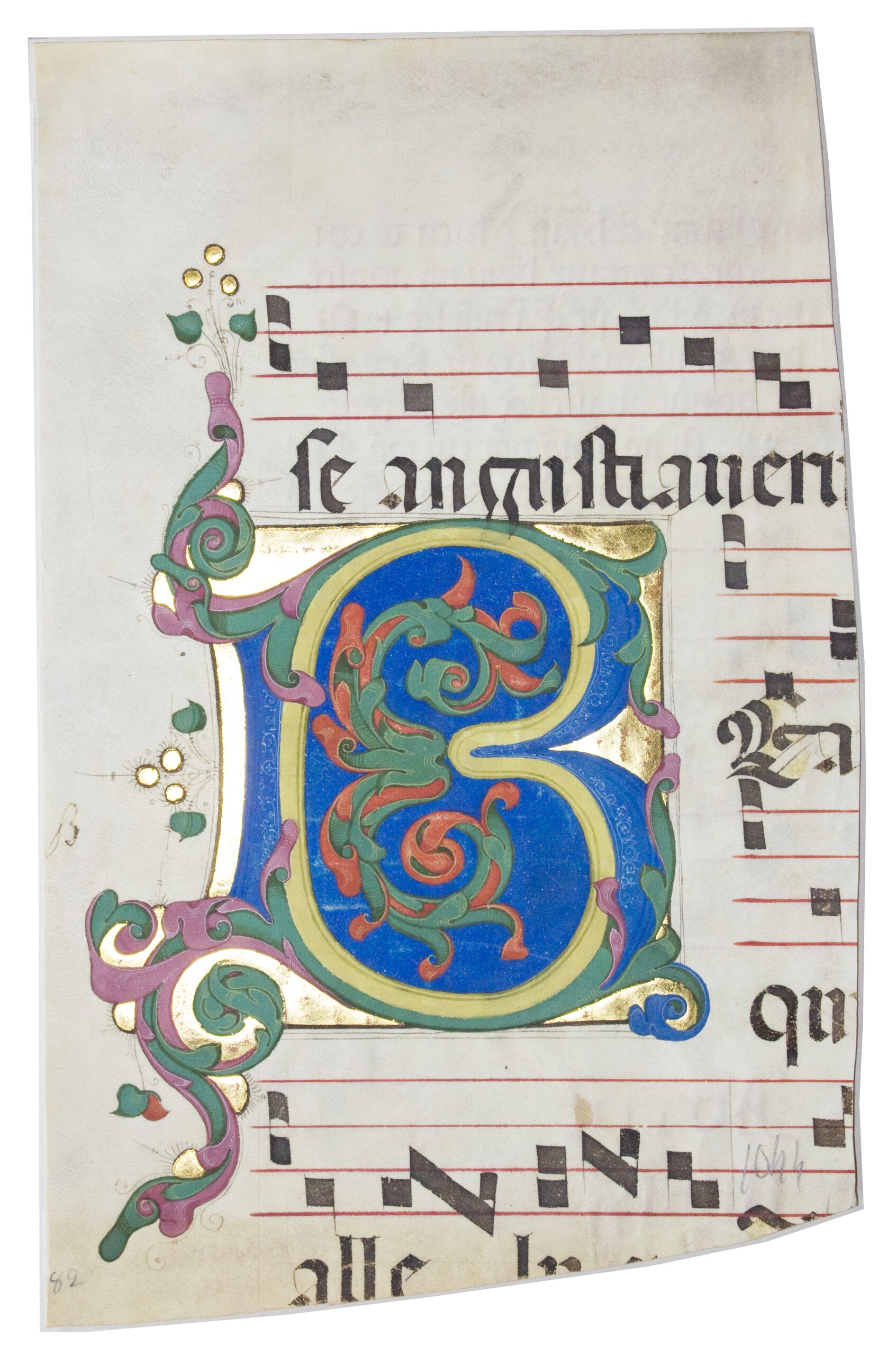 Teil eines Blattes einer Handschrift mit ausgeschnittener Initiale des Buchstabens "F". Die Initiale verläuft über fünf Zeilen, wobei diese im Wechsel von Textur und Notation angelegt sind und es sich um Quadratnotation auf vier roten Linien handelt. Der Körper der Initiale ist in Blau ausgeführt und wird von Ranken in Rosa, Blau und Grün geschmückt. Im gelb gerahmten Binnenfeld sind Blüten- und Blattornamente auf blauem Grund, während die Initiale außen von Goldgrund umgeben wird. Über die Ornamente verläuft eine filigrane Deckweißornamentik. Links am Rand gehen Teile der Ranken in die Randleiste über und werden von Goldpunkten mit Filigranornamentik flankiert. Auf dem Verso ist zusätzlich ein Teil einer Lombarde des Buchstabens "E" in Rot mit blauem Ornament- und Perlenschmuck.