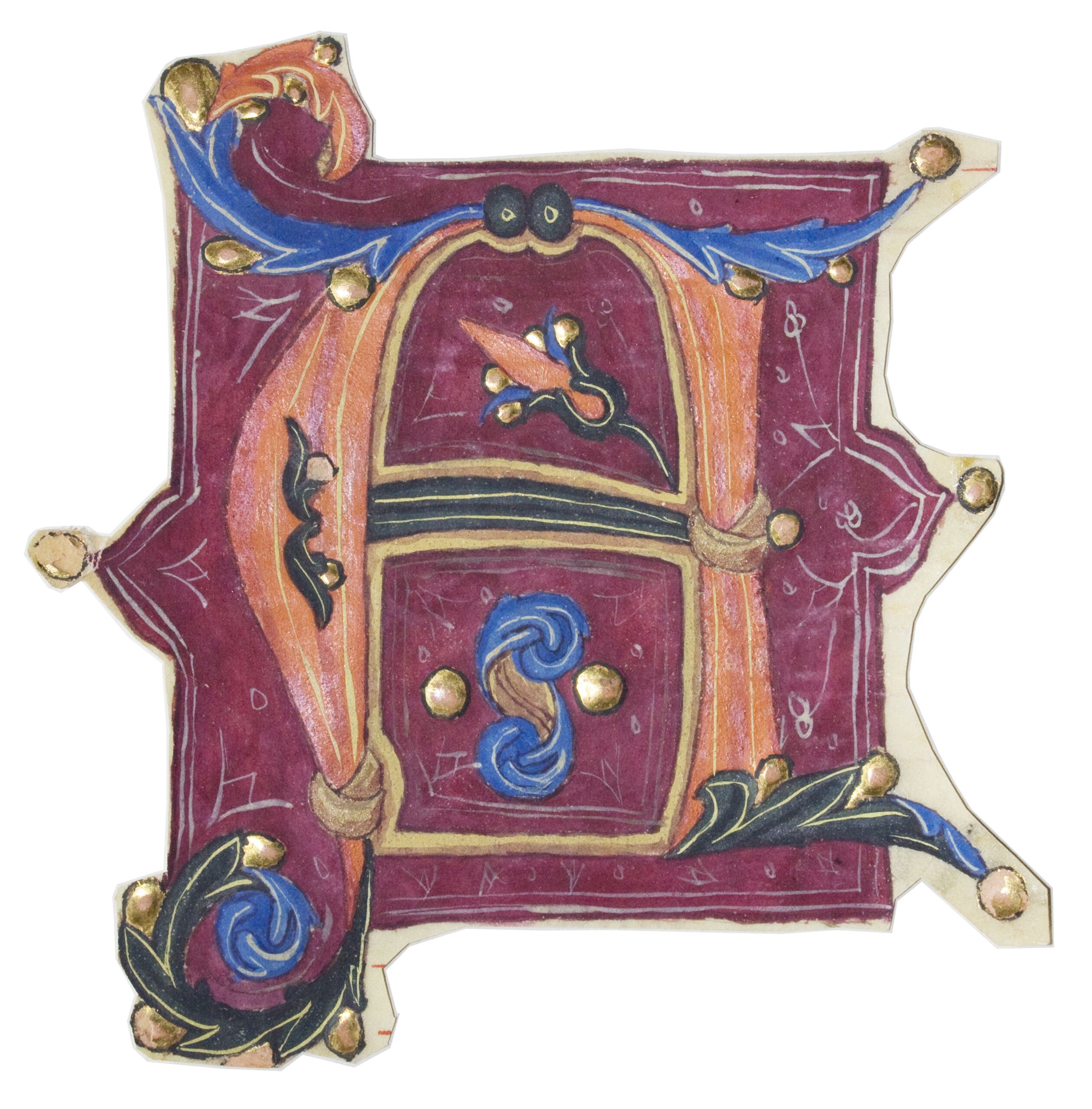 Teil eines Blattes einer Handschrift mit ausgeschnittener Initiale des Buchstabens "A". Der Körper der Initiale ist in Orange ausgeführt und wird von Ranken in Blau und Grün geschmückt. In den braun gerahmten Binnenfeldern sind Blüten- und Blattornamente auf violettem Grund, der die Initiale auch außen rahmt. Über die Ornamente verläuft eine filigrane Deckweißornamentik. Links am Rand gehen Teile der Ranken in die Randleiste über und werden zusätzlich von Goldpunkten flankiert. Auf dem Verso sind Textur und Notation im Wechsel der Zeilen angelegt, wobei es sich um Quadratnotation auf vier roten Linien handelt.