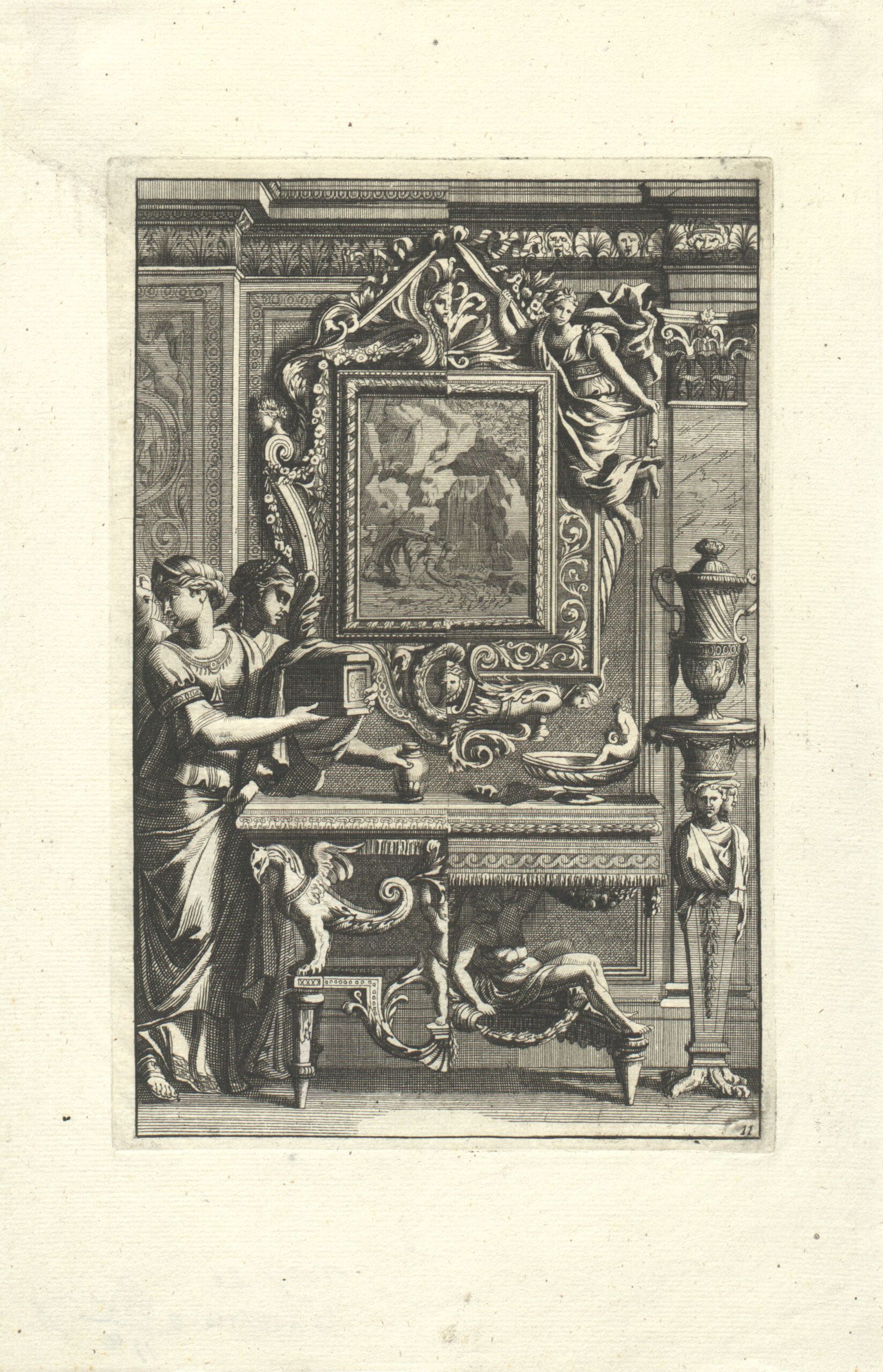 Ornamentstich, Interieur mit einem Tisch und einem Bilderrahmen, Blatt 11 aus der der Folge „Spiegels, Tafels, Geridons en Cabinetten“, Kopien nach Jean Lepautre, Jean Lepautre, MAK Inv.nr. KI 1-658-20