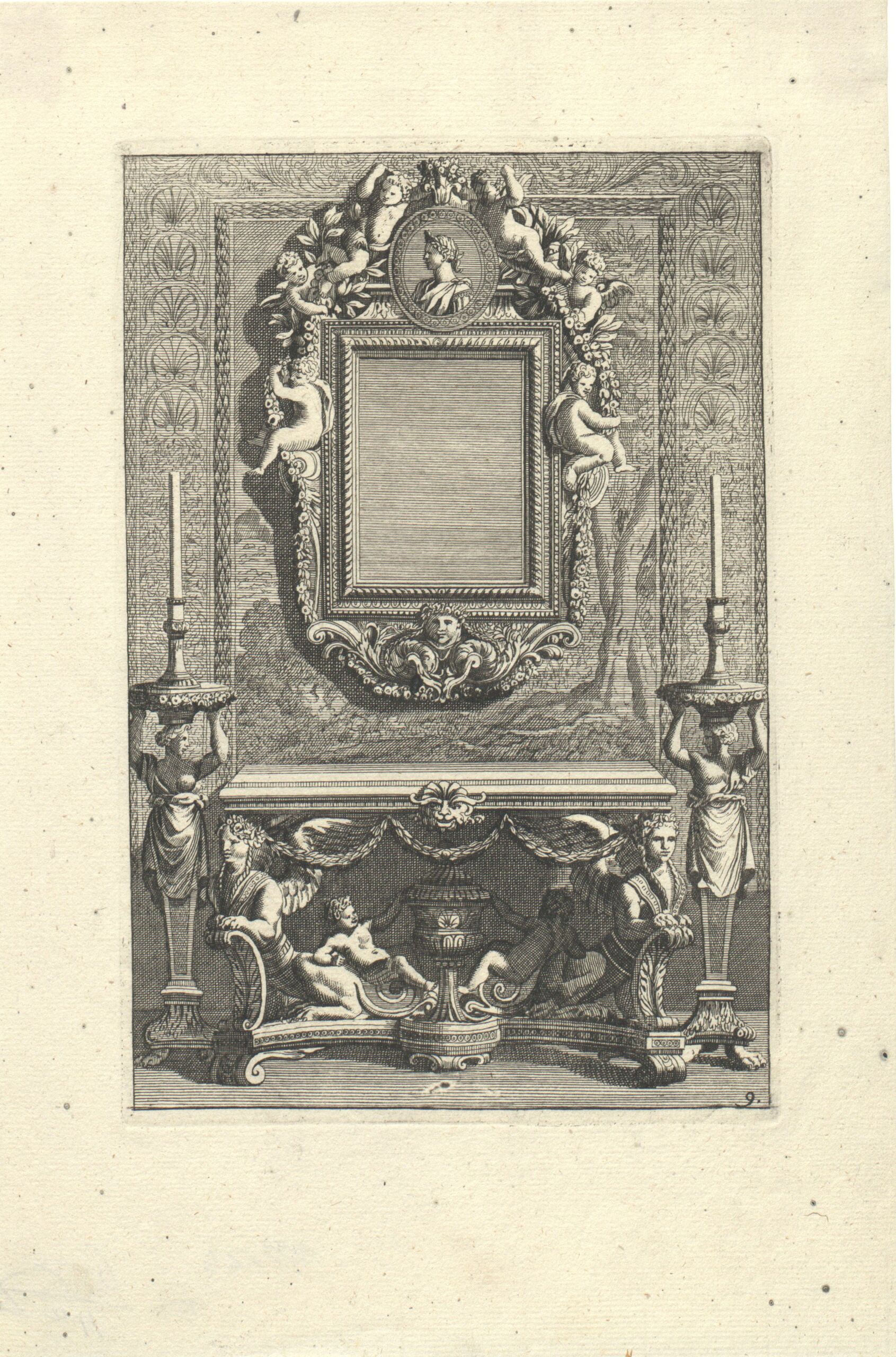 - Interieur mit einem Tisch und einem Spiegel, Blatt 9 aus der der Folge „Spiegels, Tafels, Geridons en Cabinetten“, Kopien nach Jean Lepautre (vom Bearbeiter vergebener Titel)