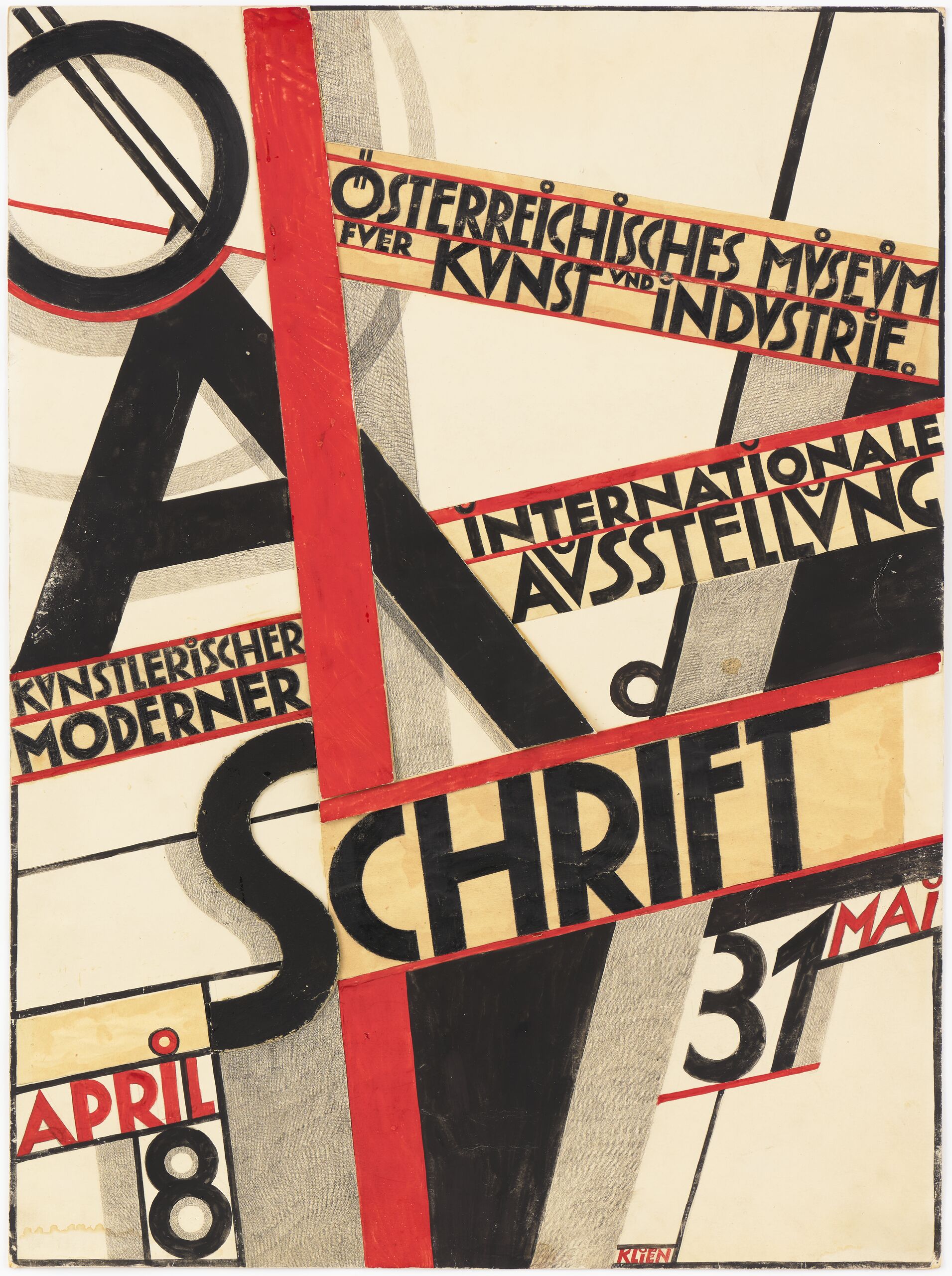 Erika Giovanna Klien trat 1919 in die Kunstgewerbeschule ein, wo sie unter anderem von Rudolf von Larisch in Schriftgestaltung unterrichtet wurde. Durch Ludwig Rochowanski und Franz von Cizek inspiriert, beschäftigte sie sich ab 1923 zusammen mit ihren Studienkolleginnen mit der Umsetzung von Bewegung und Tanz in eine geometrisch abstrahierte Bildform, die später unter dem Namen Wiener Kinetismus bekannt wurde. Klien dynamisiert das in unterschiedlichen Winkeln zueinander gestellte Schriftbild zusätzlich durch sich über- und unterschneidende Linien. Typografie und Linie werfen Schatten und geben dem Plakat dadurch beinahe räumlichen Charakter. Das Plakat für die Internationale Ausstellung moderner künstlerischer Schrift im Österreichischen Museum für Kunst und Industrie wurde jedoch nie ausgeführt.