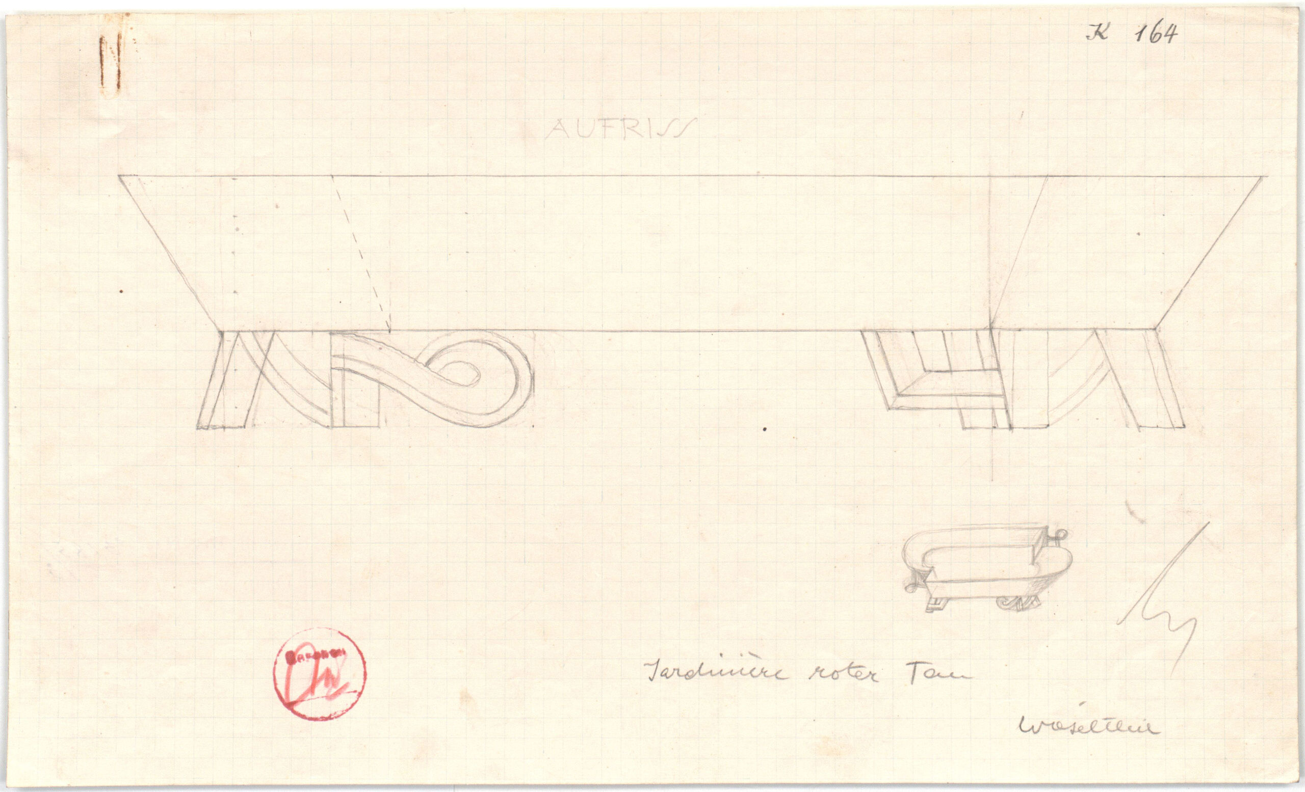 - Text am Objekt: „Jardiniere roter Ton“, „Aufriss“ Signatur, Wieselthier/ParapheStempel/Gesehen/Paraphe