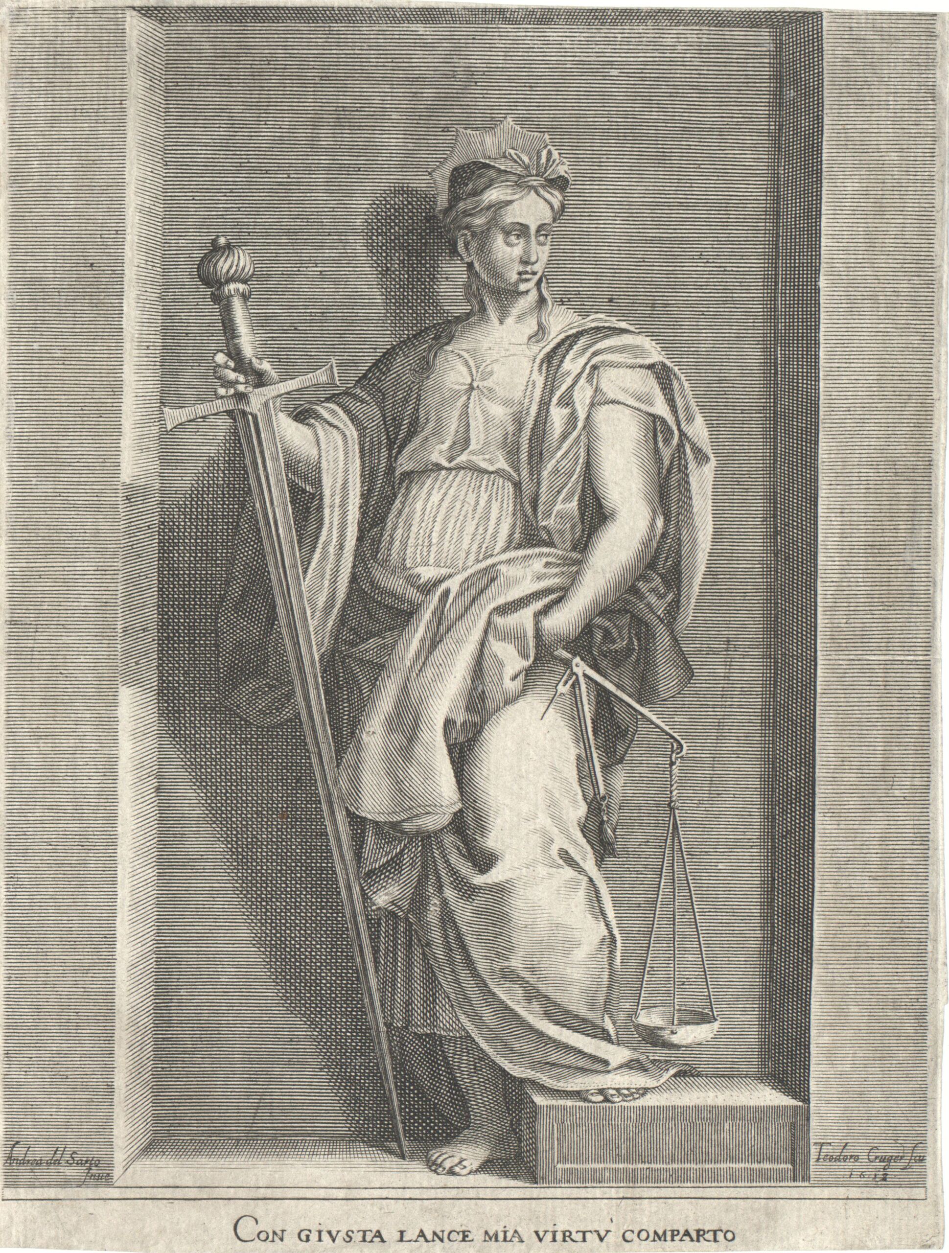 - Justitia, Blatt aus einer Folge von allegorischen Frauengestalten, verlegt von M. Querza, mit einer Widmung an Iustino Canpora (vom Bearbeiter vergebener Titel)