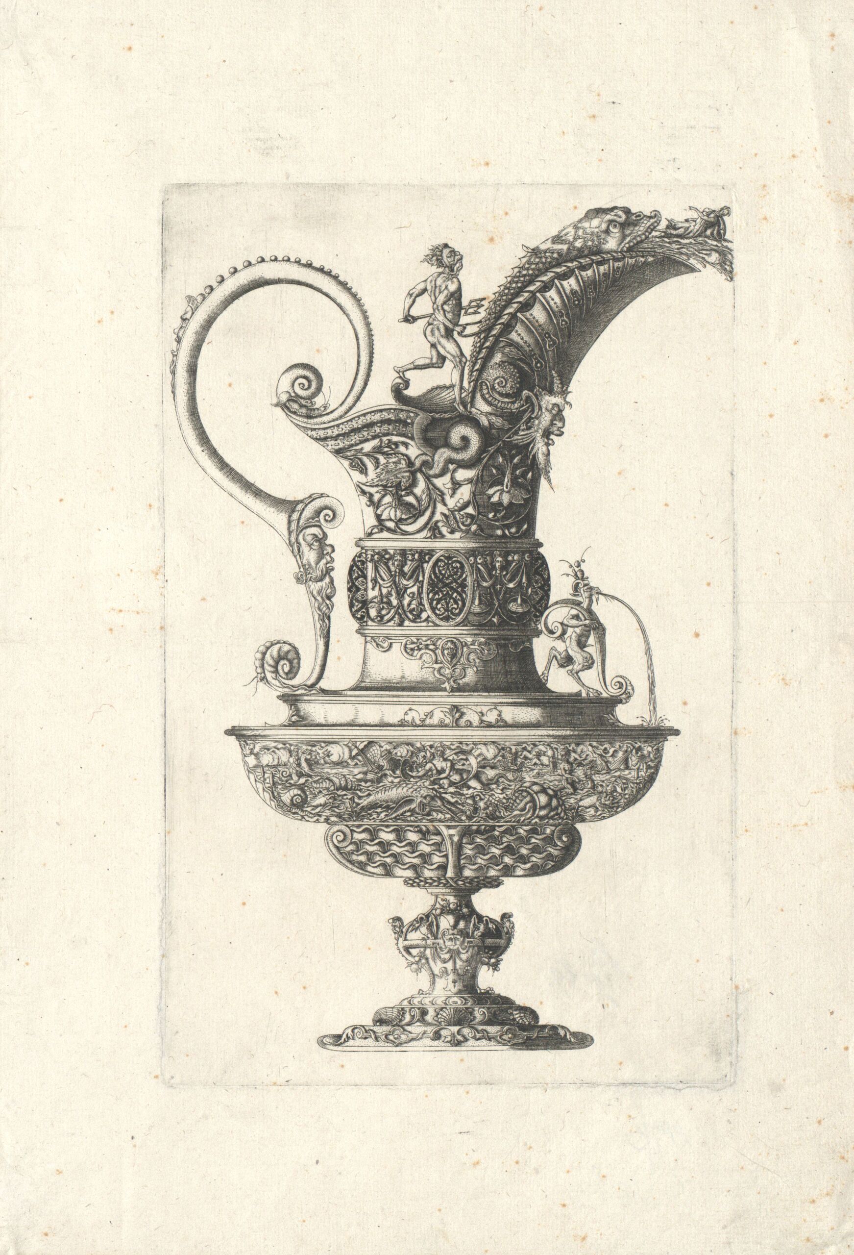 - Kanne mit Meeresgöttern, der Ausguß von einem Fisch gebildet, Blatt aus der Folge: „Insigne ac plane novum opus cratero graphicum ... Ein new Kunstbuch darjnnen kunstreiche contra fect und bildnus vom allerley Trinckgeschirrn, Credenzen und Becherm etc.”, Mathias Zündt zugeschrieben (vom Bearbeiter vergebener Titel)