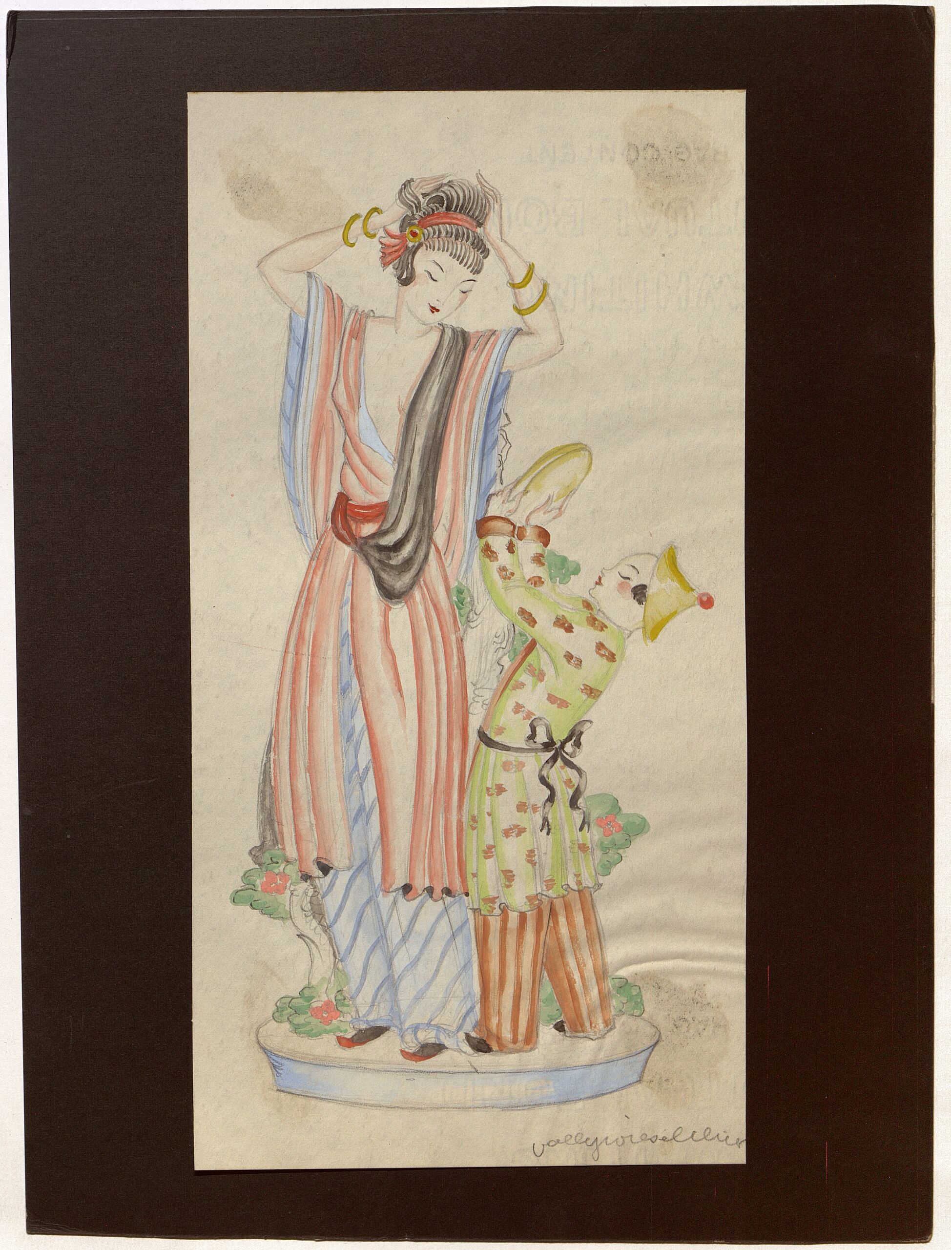 Entwurf, Keramik/Porzellan: Kleinfigur [Lampenfuß?], "Chinoiserie" Weibliche Figur und Dienerfigur mit Spiegel, Vally Wieselthier, MAK Inv.nr. NLVW 30-4
