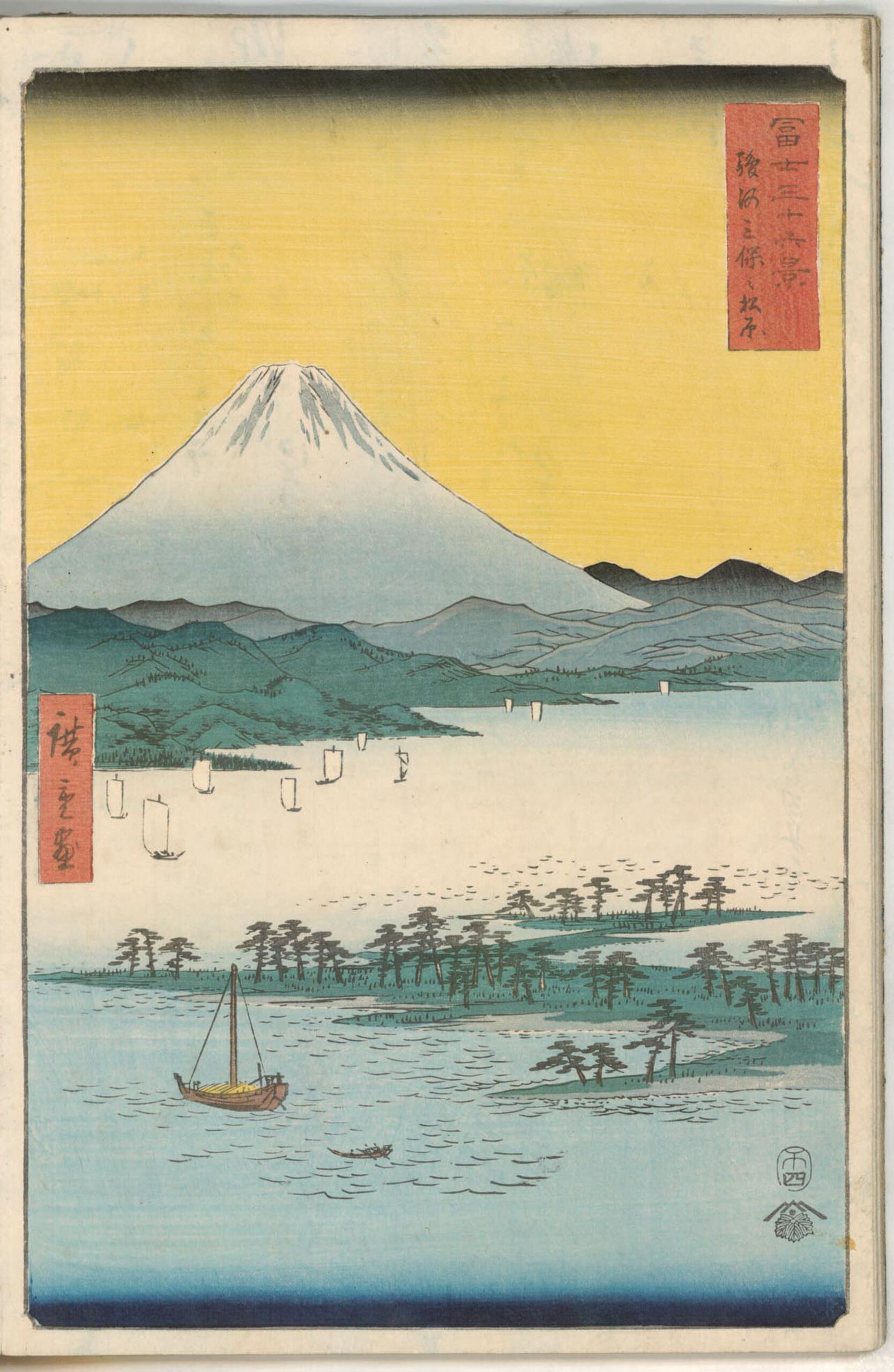 Serie der 36 Ansichten vom Berg Fuji von Hiroshige. Blick auf den Fuji von Miho 三保 aus. Im Vordergrund Matsubara (“Kiefernfeld”). Ein schneebedeckter grau-blauer Fuji vor einem satten gelben Himmel! Das Bild im Heidelberg-Katalog hat eine gelbe Signatur-Kartusche (vgl. Lit.).