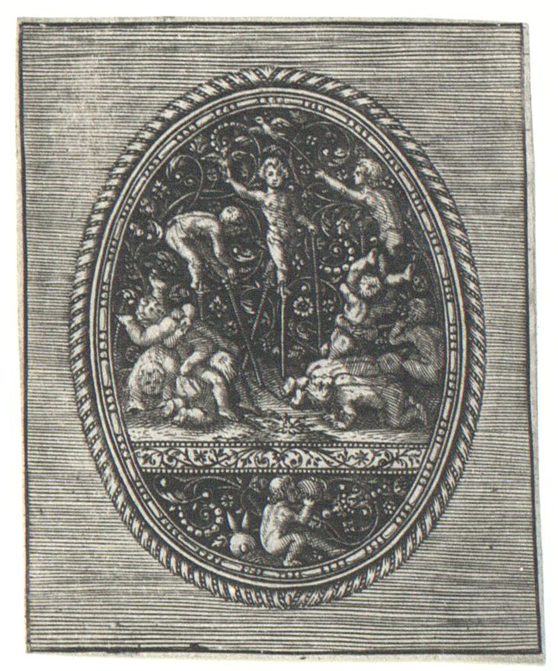 Ornamentstich, Kinder auf Stelzen gehend, in einem Oval auf schraffiertem Hintergrund, Blatt aus einer Folge von Uhrendeckel, von Schestag vormals van den Hecken zugeschrieben, Antoine Jacquard, MAK Inv.nr. KI 5781-10