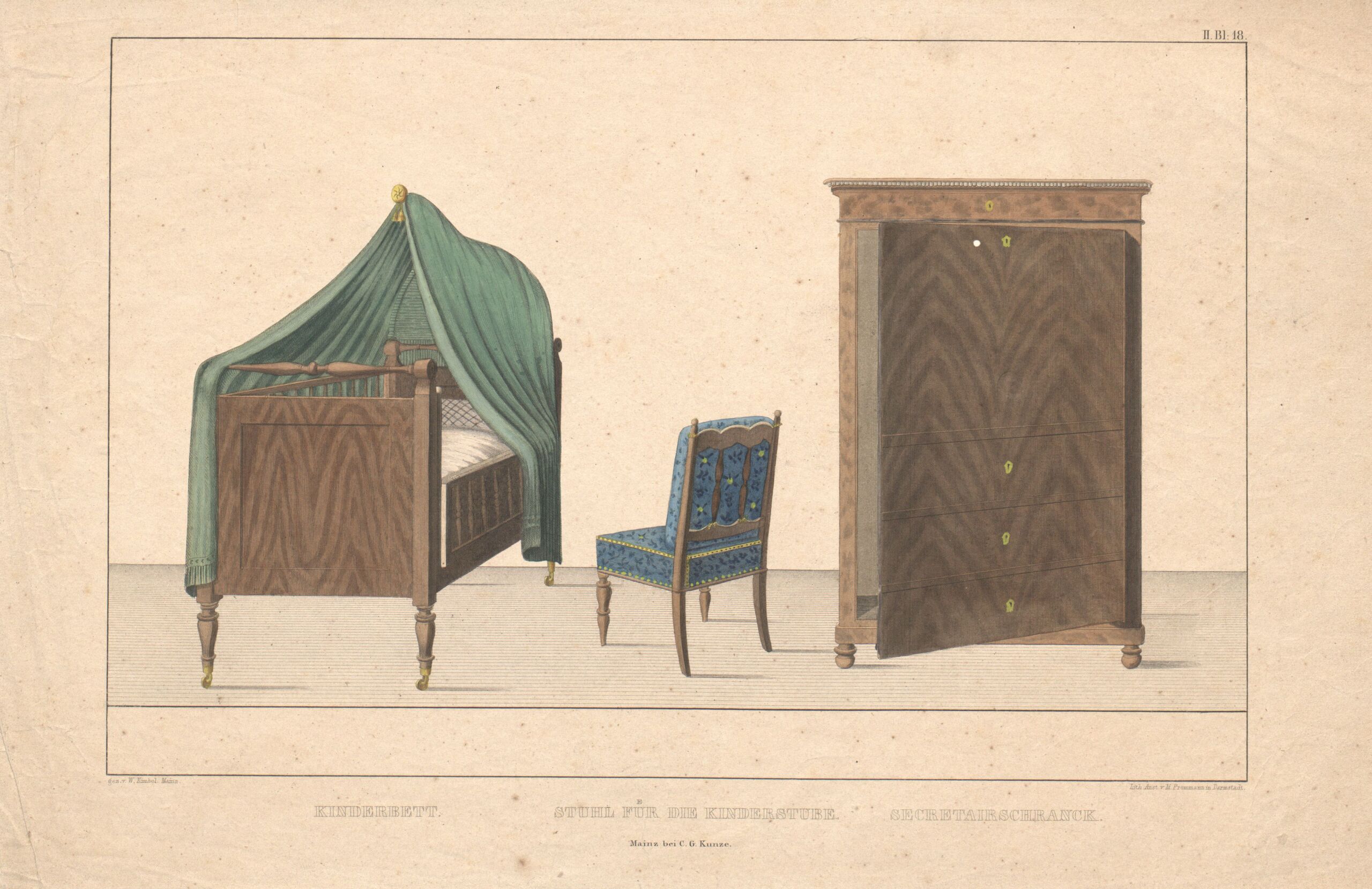 Möbelentwurf, Kinderbett. Stuhl für die Kinderstube. Secretairschrank“, Blatt 18 des 2. Jahrgangs der Folge „Journal für Möbelschreiner und Tapezierer, gezeichnet von Wilhelm Kimbel, Ebenist und Zeichenlehrer in Mainz etc.“, herausgegeben von C. G. Kunze, Wilhelm Kimbel, MAK Inv.nr. KI 13563-11